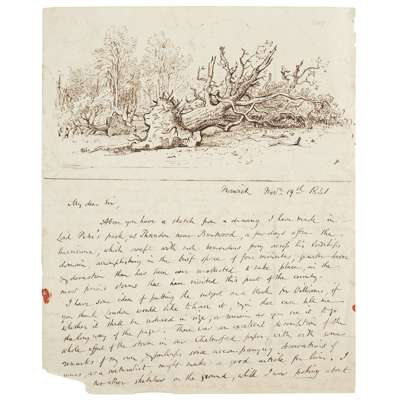 London: published for the Author, [1830]. Small folio, engraved title-page, 49 plates, contemporary quarter morocco, initial leaves and engraved title with small sections cut from upper corners, some spotting; Autograph Letter Signed from Strutt, with an original illustration of a tree, dated Norwich Nov. 19th 1831, writing about a destructive hurricane (2)