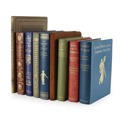 Rubaiyat of Omar Khayyam. London: George G. Harrap & Co., [n.d.] 4to, 24 tipped-in colour plates by Willy Pogány, original brown suede gilt; Quiller Couch, Sir Arthur - Edmund Dulac, illustrator The Sleeping Beauty and other Fairy Tales. London: Hodder & Stoughton, [n.d.] 4to, 30 tipped-in colour plates, original morocco-look cloth gilt; Woodward, Ida In and Around the Isle of Purbeck. London: John Lane the Bodley Head, 1908. 8vo, original green cloth gilt; Kipling, Rudyard A Song of the English. London: Hodder & Stoughton, [n.d,] 4to, 30 tipped-in colour plates by W. Heath Robinson, original blue cloth gilt; Tyndale, Walter An Artist in Italy. London: Hodder and Stoughton, [n.d.] 4to, 26 tipped-in colour plates, original blue cloth gilt; James, Grace Green Willow and other Japanese Fairy Tales. London: Macmillan and Co., 1910. 8vo, 40 tipped-in colour plates by Warwick Goble, original blue cloth gilt; Stevenson, Robert Louis Edinburgh, Picturesque Notes. London: Seeley, Jackson, and Halliday, 1879. Folio, original cloth (9)