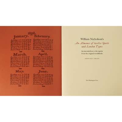 Craig, Edward William Nicholson's An Alphabet. The Whittington Press, 1978. One of 138 uncoloured copies, 38 loose sheets with woodblock prints, with accompanying leaflet, original folder; [Idem] William Nicholson's An Almanac of twelve Sports and London Types. The Whittington Press, 1980. one of 138 uncoloured copies, 34 loose sheets with woodblock prints, with accompanying leaflet, original folder (2)