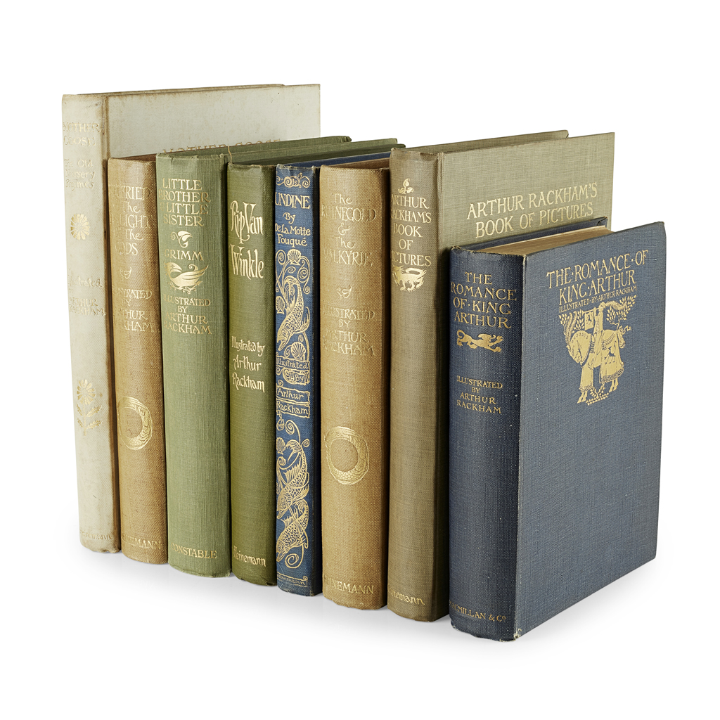 Wagner, Richard The Rhinegold & the Valkyrie. London: William Heinemann, 1910. 8vo, 34 tipped-in plates, original brown cloth gilt; Irving, Washington Rip van Winkle. London: William Heinemann, 1910. 8vo, 49 (of 50) tipped-in plates, original green cloth gilt; [Idem] Siegfried & the Twilight of the Gods. London: William Heinemann, 1911. 8vo, 30 tipped-in plates, original brown cloth gilt; Fouquém de la Motte Undine. London: William Heinemann, 1911. Second impression, 8vo, 15 tipped-in plates, original blue cloth gilt; Rhymes Mother Goose the Old Nursery Rhymes. London: William Heinemann, 1913. 4to, number 282 of 1130 signed by Rackham, 14 tipped-in plates, original white cloth gilt; Pictures Arthur Rackham's Book of Pictures. London: William Heinemann, 1913. 8vo, 44 tipped-in plates, original grey cloth gilt; Grimm, the Brothers Little Brother & Little Sister. London: Constable & Co. Ltd., 1917. 8vo, 12 tipped-in plates, original green cloth gilt; Mallory The Romance of King Arthur and his Knights of the Round Table. London: Macmillan and Co., limited, 1917. 8vo, original blue cloth gilt (8)