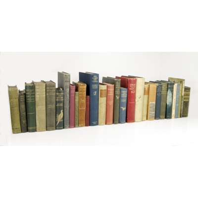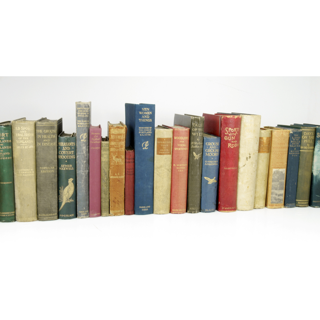 Mayer, Alfred M. Sport with Gun and Rod. London: F. Warne & Co., [1883]. Large 8vo, original red quarter morocco gilt, calligraphic gift plate to flyleaf; Mackie, Sir Peter Jeffrey The Keeper's Book. London: G.T. Foulis, [1924]. Large 8vo, original quarter Japanese vellum gilt; Smith, Thomas The Life of a Fox. London: Edward Arnold, 1896. 8vo, original half Japanese vellum gilt; Thornton, Colonel T. A Sporting Tour. London: Edward Arnold, 1896. 8vo, original half Japanese vellum gilt; Leslie, A.S., editor The Grouse in Health and in Disease. London: Smith, Elder & Co., 1912. 8vo, original cloth; Maxwell, Aymer Pheasants and Pheasant Shooting. London: Adam and Charles Black, 1913. 8vo, original blue cloth gilt; Speedy, Tom Sport in the Highlands and Lowlands of Scotland... Edinburgh: William Blackwood and Sons, 1886. 8vo, original green pictorial cloth gilt; Maxwell, Sir Herbert Wild Sports and Natural History of the Highlands. Edinburgh: Gurney and Jackson, 1927. 8vo, original cloth; and 20 others, sold not subject to return (28)
