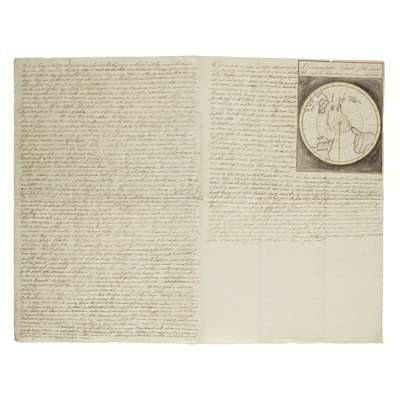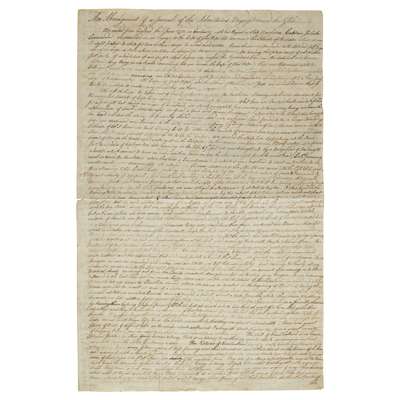 Manuscript, folio (391 x 255mm.), 3pp., in a neat copper plate hand, written largely in the first person plural, providing an overview of the voyage of the Adventure, under the command of Capt. Tobias Furneaux, with small inset "Circumpolar Chart of the South Pole with the Adventures track round the Globe" on third page, undated & unattributed, small split at fold, small tear at inner margin touching a few letters but without loss, on laid paper watermarked with a capital "H" and "D"