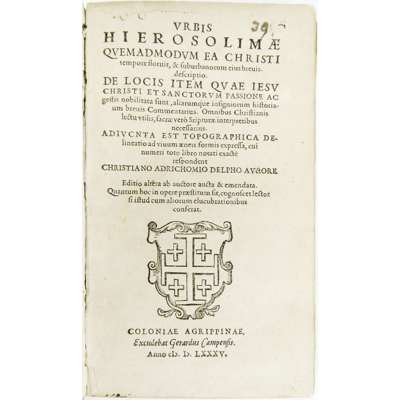 De locis item quae Jesu Christi et sanctorum passione ac gestis nobilitata sunt, aliarumque insigniorum historiarum brevis commentarius … adiuncta est topographica delineatio. Cologne: excud., Gerardus Campensis, 1585. 8vo., contemporary limp vellum, with the book plate of John Bury