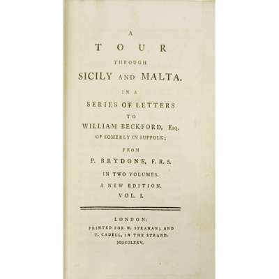 London: Richard Bentley, 1834. First edition, 2 vols., 8vo., original cloth, previous owner's signature on the title pages of both vols., discolouration of some pages, last couple of leaves in vol. 1 water stained, book plate of John Bury; Brydone, Patrick A tour through Sicily and Malta in a series of letters to William Beckford. London: W. Strahan & T. Cadell, 1775. New edition, 2 vols., 8vo., folding map as a frontispiece to vol. 1, contemporary tree calf, green silk endpapers, a.e.g., with floral fore-edge paintings under the gilt, modern rebacking (4)
