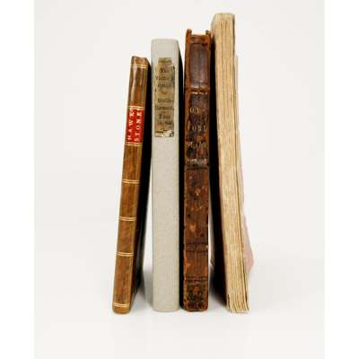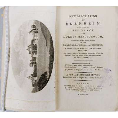 A description of Hawkstone, the seat of Sir Richard Hill, Bart. Shrewsbury: T. Wood, 1784. 2nd edition, 12mo., modern half calf, marbled boards, book plate of John Bury, ESTC T88047 listing only the British Library and Bodleian copies; Mavor, William Fordyce New description of Blenheim the seat of His Grace the Duke of Marlborough: containing a full account of the paintings, tapestry, and furniture. New and improved edition. London: T. Cadell, 1793. 8vo., engraved frontispiece, folding map of the gardens, park and plantations, original paper wrappers, printed paper label on the upper cover, lacking paper spine, with the library stamp of the Duke of Palmela on the title page, ESTC T80848 listing only four copies in the UK and one in the USA; Oxford A new pocket companion for Oxford: or, the guide through the University … to which are added descriptions of the buildings, tapestry, paintings, sculptures, temples, gardens, &c. at Blenheim, Ditchley, Heythrop, Nuneham and Stow. New edition. Oxford: for J. Cooke, 1793. 12mo., folding engraved map, 6 engraved plates, 19th century quarter calf, paper boards, by Bretherton 1850, book plate of John Bury, ESTC N41589 listing copies only at the British Library and the Bodleian, with 3 in the USA; Ibbotson, Henry The visitor's guide to Castle-Howard, the seat of the Rt. Hon. The Earl of Carlisle, containing a full and accurate account of the paintings, statues, busts, monuments and other objects of interest … the York and Scarboro' Railway; and visit of Her Majesty to Castle-Howard, August 1850. Part 1 [all published]. Ganthorpe: by the author, 1851. 8vo., modern paper boards, with original printed spine label remounted, book plate of John Bury, General Information at the front of the work informs the reader that "The mansion of Castle-Howards may be seen daily on application to Mrs. Parker, the housekeeper: and the Gardens, Pleasure Grounds &c., on application to Mr. Law, the highly respected and talented gardener." (4)