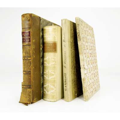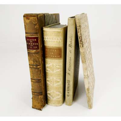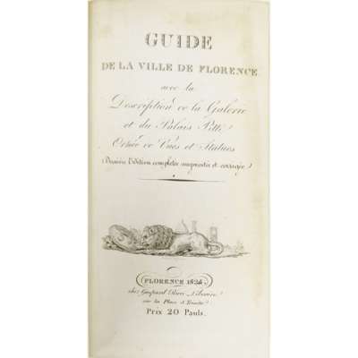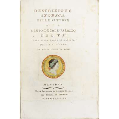 Florence: appresso Gio. Chiari, [n.d., c. 1799]. 3 parts in 1 vol., 8vo., engraved title page to each part, with 86 engraved plates of 320 statues or statuary groups, the first part comprising the statues in the Boboli Gardens, contemporary half calf, marbled boards, wear to head and tail of spine, first title page a little and with ownership inscription of James Tyler, Florence, 181?, with the book plate of Cecil F. Crofton on the front pastedown, and the book plates of John and Michael Bury on the rear; Cambiagi, Gaetano Descrizione dell'Imperiale giardino di Boboli. Florence: Stamp. Imperiale, 1757. 8vo., half vellum, marbled boards, uncut, title page a little dusty and with small neat inscription on the title page, a few leaves with marginal notes in a contemporary hand; Guide de la ville de Florence. Florence: Gaspard Ricci, 1825. 2nd edition, 8vo., numerous engraved plates (including a folding plan of the city and other folding plates), contemporary vellum, spine decorated gilt, red morocco lettering piece, with the book plates of John and Michael Bury; Bottani, Giovanni Descrizione storica delle pitture del Regio-Ducale Palazzo del Te fuori della porta di Mantova detta Pusterla con alcune tavole in rame. Mantua: Giuseppe Braglia, 1783. 8vo., engraved portrait frontispiece and 3 folding engraved plans, wrappers (4)