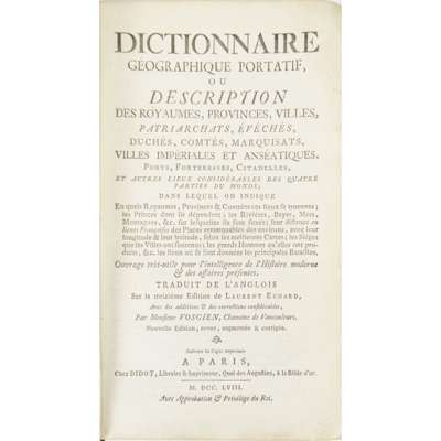 being a short and exact analysis of the whole body of modern geography. London: for J. Nicholson [et al.], 1711. 6th edition, 8vo., title page in red and black, with 16 engraved folding maps, with that of the world with the surrounding decorations hand coloured and the other maps hand coloured in outline, 18th century mottled calf, repairs to head and tail of spine, short tear to foot of p. 265 (through a couple of lines of text, but no loss) few wormholes, mostly confined to single wormholes at the inner or lower margins, signature of Francis Midon on the half title (author of The History of the Rise and Fall of Masaniello, the Fisherman of Naples, 1729?), book plates of John and Michael Bury; Echard, Laurent Dictionnaire geographique portatif, ou description des royaumes, provinces, villes, patriarchats, eveches, duches, comtes, marquisats, villes imperials et anseatiques, ports, forteresses, citadelles, et autres lieux considerables des quatre parties du monde … traduit de l'anglois sur la treizieme edition … par Monsieur Vosgien … Nouvelle edition, revue, augmentee & corrigee. Paris: chez Didot, 1758. 8vo., with a folding engraved world map, contemporary mottled calf, spine decorated gilt in compartments, with the book plates of John and Michael Bury (2)