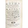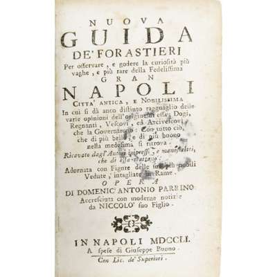 e godere la curiosita piu vaghe, e piu rare della fedelissma gran Napoli, citta antica, e nobilissima. Naples: Giuseppe Buono, 1751. 12mo., with 41 woodcut plates (including a frontispiece and 2 folding), c ontemporary vellum, with the book plates of John and Michael Bury; Orsini, Baldassare Descrizione delle pitture, sculture, architetture ed altre cose rare della insigne citta di Ascoli. Perugia: nella Stamperia Baduelliana, 1790. 4to., with an engraved title page and 18 engraved plates (1 folding), contemporary patterned paper boards, spine worn, upper inner joint broken, some paper discolouration and spotting, with the book plate of John Bury; Cambiagi, Gaetano Descrizione dell'Imperiale giardino di Boboli. Florence: Stamp. Imperiale, 1757. 8vo., paper wrappers, margins and edges a little spotted; Varola Sesia Sacro Monte di Varallo. La nuova Gerusalemme. Varallo, per Giosppe Draghetti, 1743. 16mo., frontispiece and 50 woodcuts in the text. contemporary vellum, paper discoloured and stained; Varola Sesia Sacro Monte di Varallo. Direttorio per ben visitare la nouva Gerusalemme. Milano: Pietro Franceso Malatesta, 1747. 8vo., with a woodcut frontispiece and 57 other woodcut illustrations in the text (some full page),contemporary calf, some paper discolouration and staining throughout, book plate of John Bury, and 3 others (8)