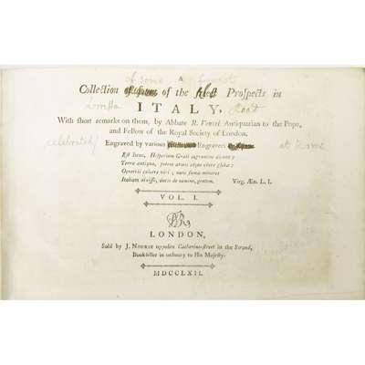 Note: Etched frontispiece and 22 views by James Forrester after Peter Stephens, and by Nicole after W(?)R. Those by Stephens and Forrester bear date 1760. Originally issued in 1761 in Italy as Raccolta di alcune delle piu belle vedute, the date and title of which appear on the frontispiece.