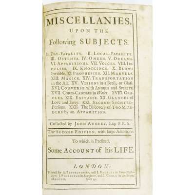 Note: Aubrey's Miscellanies is a collection of chapters on hermetic philosophy.The author was fascinated by the occult and supernatural, and 'Miscellanies' is a broad-ranging study, with sections on auspicious and inauspicious dates, omens, communications with angels, and magic, as well as a study of 'second sight' (the ability to foresee future events through divine inspiration) that is reputed to be the first treatment of the subject to appear in print. The chapter on "magic" includes a few short references to witches and witchcraft: notably "Vervain and dill, Hinders witches from their will", and several stories recounting methods used to hinder witchcraft. The book was first published in 1696. This second edition, revised and enlarged, includes an account of the author's life.
