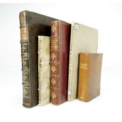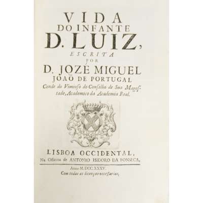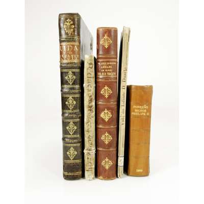 primeiro deste nome dos reys de Portugal com alguns sermões que neste reyno se fizerão. Lisbon: Pedro Crasbeeck, 1600. 4to., contemporary limp vellum, worm hole in text of first couple of signatures affecting some letters of text, inner joints weak, with the library stamp of the Duke of Palmela on the title page and with the book plates of John and Michael Bury, USTC 345570; Porreno, Baltasar Dichos y hechos del Rey Don Phelipe II. Brussels: por Francisco Foppens, 1666. 12mo., contemporary panelled calf, rebacked, with the stamp of the Duke of Palmela on the title page and with the book plate of John Bury; Portugal, José Miguel João de, Conde do Vimioso Vida do Infante D. Luiz. Lisbon: Antonio Isidoro da Fonseca, 1735. 4to., fine engraved protrait of Dom. Luiz by Debrie, contemporary sprinkled calf, book plate of John Bury; Rezende, André de Vida do Infante Dom Duarte. Lisbon: Academia Real das Sciencias, 1789. 4to., paper wrappers, uncut, with the gold stamp of Guimarães Quinta do Salgueiral on the title page, and the book plate of John Bury; Sousa, Luiz de Anais de el Rei Dom Joao Terceiro. Lisbon: Typ. De Sociedade Propagadora dos Conhecimentos Uteis, 1844. 8vo., contemporary calf, original printed wrappers bound in, library stamp of the Visconde de Coruche on the title page and on the front wrapper, paper discoloured throughout, book plate of John Bury (5)