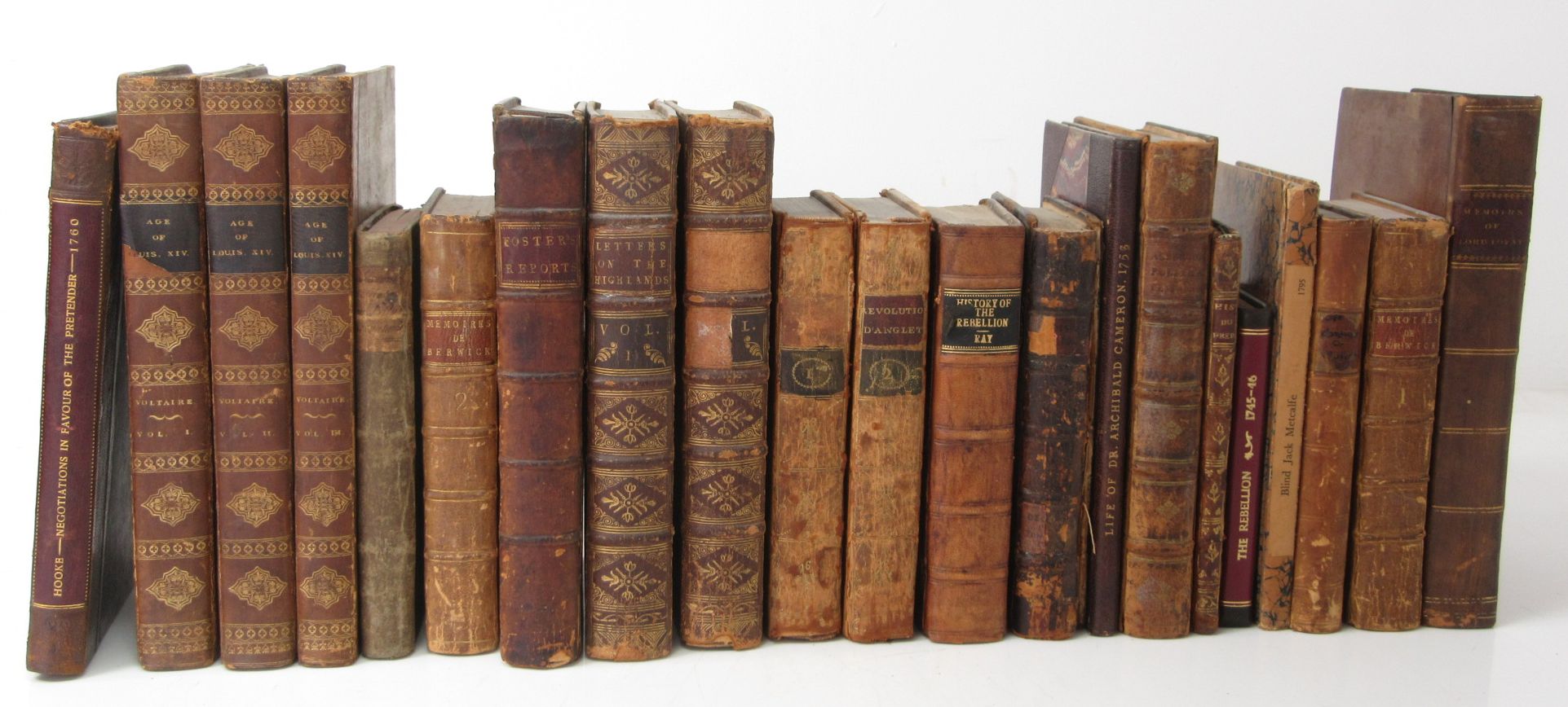 [Cameron, Archibald]. The Life of Dr. Archibald Cameron. London, 1753, 8vo, frontispiece portrait and 1 plate, 19th century half morocco, [ESTC N3516]; Graham, D. An Impartial History of the Rise, Progress and Extinction of the Rise, Progress and Extinction of the late Rebellion. Glasgow: J. Robertson, 1772, 12mo, calf, browned, a few leaves repaired with loss; [Griffiths, Ralph] L'Ascanius Moderne." Edimbourg" (probably France), 1763. 8vo, folding plates, original boards, [ESTC T71880]; [Hooke] The Secret History of Colonel Hooke's Negotiations in Scotland, in favour of the Pretender, in 1707. London, 1760, 8vo, 19th century half calf, [ESTC T71121]; [Burt, Edward]. Letters from a Gentleman in the North of Scotland. London: J. Pottinger, 1759. Second edition, 2 volumes, 8vo, engraved plates, contemporary calf, bookplates of the Earl of Lonsdale, [ESTC T65245]; [Anon]. Histoire du Prétendant. [Paris], 1756. 8vo, contemporary calf, head of spine rubbed; Alberoni, Julius. The Political Testament of. London, 1753. 8vo, contemporary calf, joints cracking; Addison, J. The Free-Holder. London, 1751. 12mo, calf, worn, boards detached; [Ray, J.] A Compleat History of the Rebellion. Manchester, [?1747], 12mo, contemporary panelled calf, rebacked, [ESTC T118420]; Foster, Michael. A Report of Some Proceedings on the Commission for the Trial of the Rebels in the Year 1746. Second edition, 8vo, contemporary calf, rubbed; Berwick, James Fitjames, Duke of. Mémoires. Paris: Moutard, 1778. 2 volumes, 12mo, contemporary calf; Voltaire, F.M.A. de The Age of Louis XIV. London, 1779. 3 volumes, 8vo, 2 frontispieces, 19th century half calf; Turpin, M. Histoire des Révolutions d'Angleterre. Paris, 1786. 2 volumes, 12mo, contemporary calf, rubbed; Doddridge, P. Some remarkable passages in the life of the Honourable Col. James Gardiner, who was slain at the Battle of Preston-Pans. 1792. 12mo, half calf, rubbed; [Anon.] The Life of John Metcalf... expedition against the Rebels in 1745. York, 1795, 12mo, engraved frontispiece, modern boards, [ESTC N25439]; Lovat, Simon, Lord. Memoirs of the Life of. London, 1797. 8vo, contemporary calf (21)