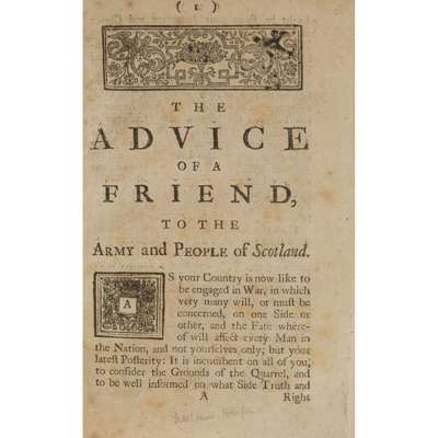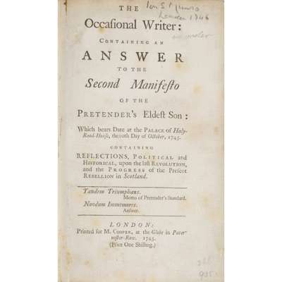 The Chronicles of Charles, the Young Man. [Edinburgh?: s.n., 1745] 8vo, 8pp, half-title, sellotape strengthening to first and last page, disbound, [ESTC T116754][Earbery, Matthias] An Historical Account of the Advantages that have accrued to England. London [i.e. Edinburgh?]: Re-printed, 1745. 8vo, 40pp., modern boards, [ESTC T130801]; [Fielding, Henry] A Serious Address to the People of Great Britain... Present Rebellion. London: M. Cooper, 1745. Third edition, 8vo, 47pp., modern boards, [ESTC T89828]; Asgill, John The Pretender's Declaration English'd. London: J. Roberts, 1715. 8vo, 24pp., disbound, title dust-soiled, [ESTC T44262]; [Fowler, William] A True Account of the Most triumphant and royal Grandeur at the Solemnization of the Baptism of His Royal Highness, Henry, Prince of Scotland. Edinburgh, for Philander, 1745. 8vo, 16pp., [sellotape strengthening to spine affecting a few letters, disbound, [ESTC T1057]; [Skelton, Philip] The Chevalier's Hopes. Dublin: J. Edsdall, 1745. 8vo, 31pp., modern boards, [ESTC T108576]; [Webb, Philip C.] Remarks on the Pretender's Declaration and Commission. London: E. Say, 1745. 8vo, 70pp, cloth boards, [ESTC T46831]; [Harper, William] The Advice of a Friend, to the Army and People of Scotland. [Edinburgh ?, s.n., 1745?], 8vo, 32pp., drop-head title, modern boards, [ESTC T120871]; [Anon.] A Letter in Latin and English. Edinburgh, 1745, 8vo, 8pp., sellotape repair to spine affecting a few letters on p. 8, disbound, [ESTC T57572]; [Anon.] A True and Full Account of the late and Bloody and Desperate Battle fought at Glassmuir. [Edinburgh?, 1745], 8vo, 8pp., drop-head title, some staining, [ESTC T71227]; Anon. The Question, Whether England can be otherwise than miserable under a Popish King ? London, Oct. 1745. 12mo, 12pp., sellotape strengthening to spine, disbound, [ESTC N55294: 1 copy only (Oxford)]; [Anon.] An enquiry into the conduct of G-l Cope. London: M. Cooper, 1745. 8vo, 24pp., modern boards, lacks half-title, [ESTC T96395]; [Anon.] Cardinal Tencin's Plan, Presented to the French King, for Settling the Pretender's Family upon the British throne. London: M. Cooper & G. Woodfall, 1745. 8vo, [5], 10-28pp., half-title, modern boards, [ESTC N26726, 6 copies UK, 2 in N. America]; [Prestongrange, William Grant, Lord] The Occasional Writer, containing an Answer to the Second Manifesto of the Pretender's Eldest Son. London: M. Cooper, 1745. 8vo, [2], 54pp., modern boards, slightly spotted, [ESTC T26231]