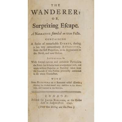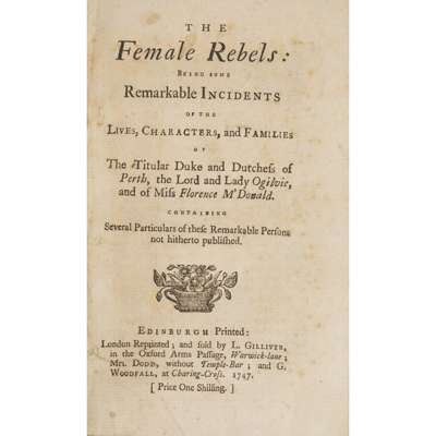 [Mansfield, William Murray, Earl of] The Thistle. London: H. Carpenter, 1747. 8vo, 4pp.., modern boards, [ESTC T126500]; [Anon.] The Female Rebels... Duke and Dutchess of Perth... Miss Florence M'Donald. Edinburgh Printed, London Reprinted: L. Gilliver &c., 1747. 8vo, modern boards, [ESTC T145420, 9 copies UK, 3 N. America]; Hughes, Michael. A Plain and Authentic journal of the late Rebellion, begun in 1745. London: H. Whitridge, 1747. 8vo, brown half morocco gilt, [ESTC T55102]; "Atticus" A Congratulatory Letter to John Murray, Esq. late secretary to the Young Pretender. London: W. Webb, 1747. 8vo, modern boards, [ESTC T87627, 10 copies UK, 7 copies N. America]; [Anon.] National Union Recommended, in Answer to a late scurrilous Paper. Edinburgh, 1747. 8vo, 8pp., sellotape repair to inner margin of title and final leaf, some dust-soiling, disbound, [ESTC T59151, 7 copies UK, 2 N. America]; [Anon.] To Mr S---- M--- on his Turning Evidence. ["London: T. Cooper, 1747" - possibly Edinburgh], 8vo, 4pp., repaired with slight loss of text, marbled boards, [ESTC T61492]; [Anon] The Rose: being a Detection of the pernicious Tendency of Two Libels. London: J. Roberts, [1747], 8vo, [2], 50pp., modern boards, [ESTC T45233]; C.L. The Advantages of the Succession of the House of Stewart. London: F. and J. Noble, 1747. 8vo, [8], 74pp., quarter cloth, [ESTC N16107][Anon.] An Address by a Minister of the Church of Scotland to his Congregation. [Edinburgh?], 1747. 8vo, 23pp., modern boards, [ESTC N1766, 4 copies UK, 3 N. America]; Whitelock, Methuselah] The Peace-Offering. London: L. Raymond & A. Moore, 1746. 8vo, 36pp., marbled boards, final leaf repaired, [ESTC N11521, 5 copies UK, 10 N. America]; [Anon.] The Wanderer: or, Surprizing Escape. London: J. Robinson, 1747, modern boards, [ESTC T52183] (11)