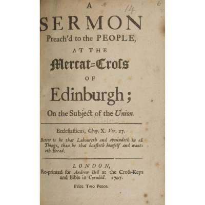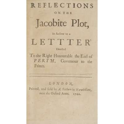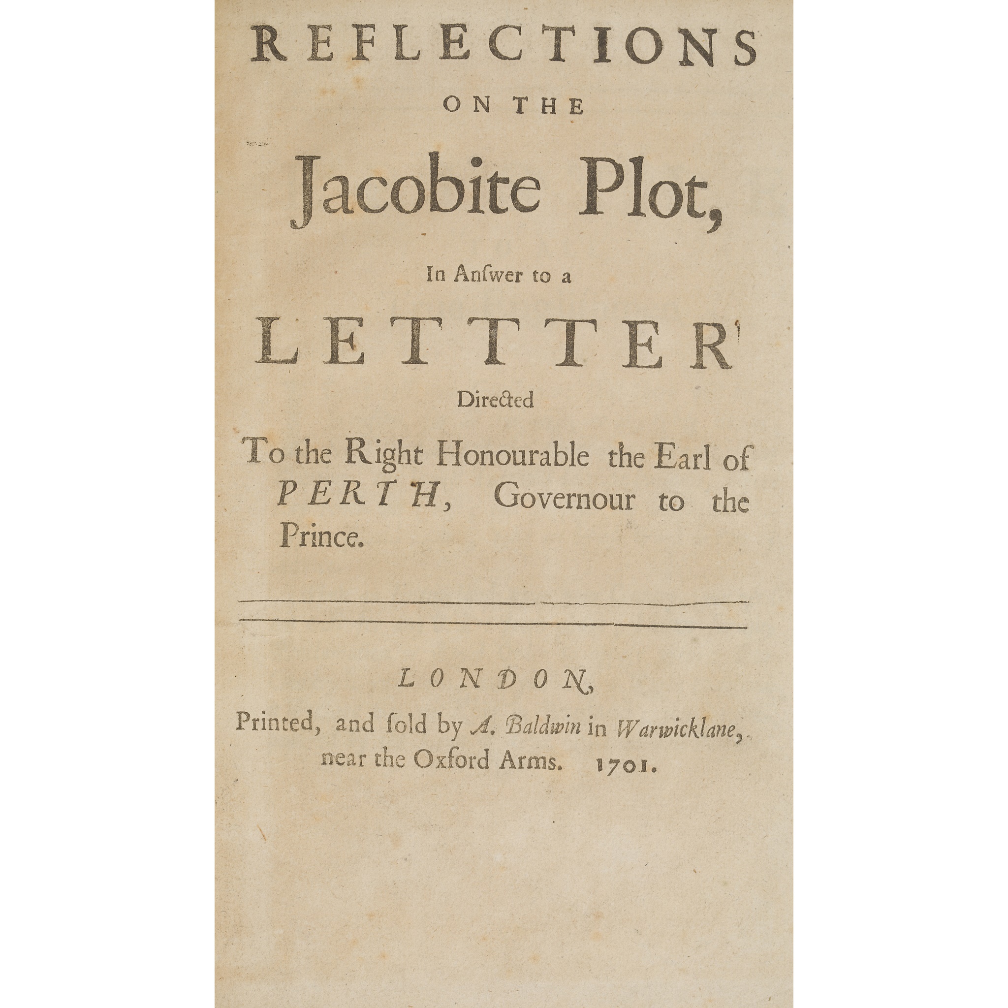 A List of one Unanimous Club of Members of the Late Parliament. Nov. 11 1701. [London: Printed in the Year 1701], 4to, 4pp., drop-head title, 19th century calf, [ESTC N21430, 1 copy UK (Cambridge, Trinity), 3 in N. America], spine rubbed; [Anon.] Reflections on the Jacobite plot. London: A. Baldwin, 1701. 4to, modern boards, [ESTC T13185; 7 copies UK, 5 in N. America]; [Ridpath, George] The Massacre of Glencoe. London: J. Johnson, [?1703], 8vo, modern boards, some spotting, title repaired in inner margin affecting a few words, [ESTC T207718, 3 copies UK, 1 in N. America]; [Arbuthnot, John] A Sermon Preach'd to the People at the Mercat-Cross of Edinburgh, on the Subject of the Union. London: A. Bell, 1707, [ESTC T492113]; bound with [Bellhaven, John Hamilton, Baron] The Lord Beilhaven's Speech in the Scotch Parliament... on the Subject-matter of an Union. Printed in the year 1706. 8vo, [ESTC N61380], 2 works in one volume, quarter morocco; [Shaftoe, Frances] Mrs Frances Shaftoe's Narrative, containing an Account ... that the Pretended Princes of Wales was Sir Theophilus's Son. London: H. Hills, 1708, 8vo, half calf, upper board detached, [ESTC T147663]; [Anon.] The Flight of the Pretender. London: H. Hills, 1708. 8vo, wrappers, [ESTC T81610] (6)