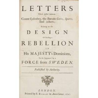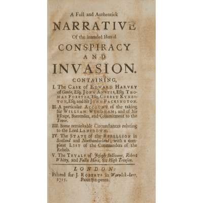 [Andews, Charles] A Full and Authentick Narrative of the Intended Horrid Conspiracy and Invasion. London: J. Roberts, 1715. 8vo, [2], 38pp., modern boards, [ESTC T40289]; Leslie, Charles. Mr Leslie to the Lord Bishop of Sarum. [London, 1715], 8vo, 20pp., drop-head title, stapled, disbound, [T149709, 4 copies UK, 3 N. America]; [Burnet, Archibald] [A Paper left by Mr Burnet of Carlops some time before he was executed for being in arms at Preston. Paris, 1717], manuscript copy, 18th century, 19th century half calf, spine worn, [ESTC T170832, 2 copies UK]; [Anon.] A Dialogue between a Whit and a Jacobite, upon the Subject of the late Rebellion. London: J. ROberts, 1716. Third edition, 8vo, 32pp., quarter calf, upper cover detached, [ESTC T180021, 4 copies UK, 3 N. America]; [Anon.] A Journal of the Earl of Marr's Proceedings. Reprinted in London: J. Baker, [1716], 8vo, xvi, 32pp., modern boards, [ESTC T69396]; [Anon.] The Secret History of the Rebels in Newgate. London: A. Dodd & J. Harrison, [1717], 8vo, 48pp., half calf, some spotting, armorial bookplate of Robert Crewe-Milnes, 1st Marquess of Crewe, [ESTC T172450, 7 copies UK, 3 N. America]; [Defoe, Daniel] Secret Memoirs of a Treasonable Conference at S.... House. London: J. More, 1717. 8vo, [2], 78pp, calf, slightly spotted, lacks lower cover, upper cover detached [ESTC T69391]; Gyllenborg, Carl Letters which passed between Count Gyllenborg... relating to the Design of Raising a Rebellion in Her Majesty's Dominions. London: S. Buckley, 1717. Folio, modern boards, [ESTC T61824]; Forster, Thomas A Letter from Fr. Forster to his Acquaintance in London. London: T. Warner, 1717. 8vo, [2], 22pp., sellotape to spine, title browned, disbound, [ESTC T195387, 3 copies UK, 2 N. America] (9)
