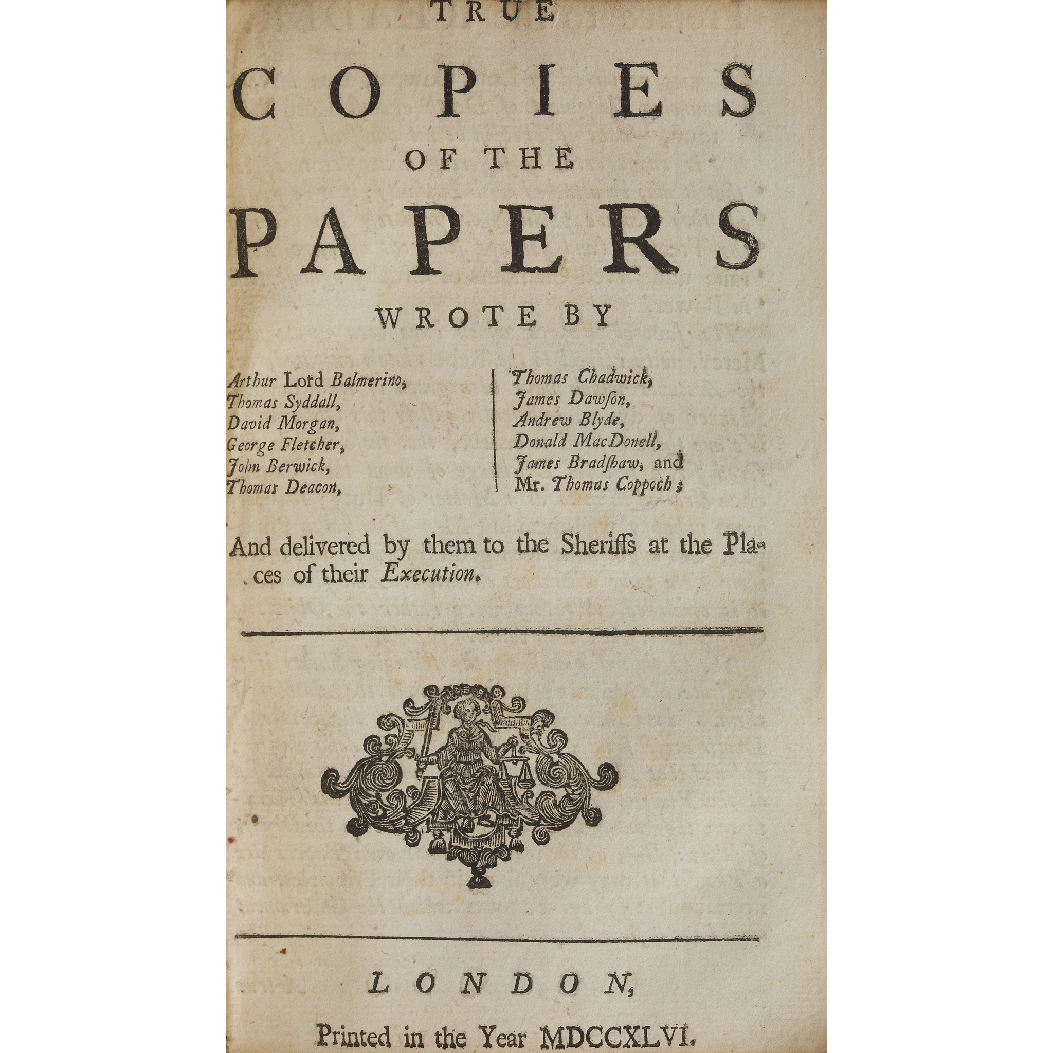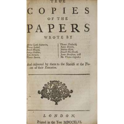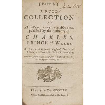 Part I. Full Collection of all the Proclamations and Orders published by the Authority of Charles Prince of Wales. [Glasgow], 1745, [ESTC N18804]; Part II. A Full and True Collection of all the Orders, Proclamations and Papers... Glasgow, 1746, [ESTC N48437]; [Harper, William] The Advice of a Friend to the Army and People of Scotland. drop-head title, [Edinburgh?, s.n., 1745?], [ESTC T120871]; [Anon.] The Chronicle of Charles the Young Man. [Edinburgh?, s.n., 1745], [ESTC T116754]; Caledonian Mercury The Battle of Falkirk.... from the Caledonian Mercury. Printed at Bannockburn, 1746. Single folio sheet, folded, drop-head title, closed tear, [ESTC T21418]; [Anon.] An Authentick Account of the Conduct of the Young Chevalier. London: Nutt, Dodd &c., 1749. Third edition, [ESTC T22792]; [Anon.] A Full Collection of all Poems upon Charles Prince of Wales. [?Edinburgh], 1745, [ESTC T55715]; [Various authors] True Copies of the Papers wrote by Arthur Lord Balmerino. London, 1746; Part II. A Genuine Copy of the last words and dying Speech of the Reverend Mr Robert Lyon; Philibert A Poem, compos'd the Second of November 1747, the day the Honourable Archibald Stuart. [Edinburgh, 1747], 4to, 4pp., torn without loss of text, [ESTC N11689] [Anon.] An Ode for the Thanksgiving-Day by Titus Antigallicus. [? Edinburgh, 1749], 8vo, 4pp., folded, [ESTC T90305]; [Earbery, Matthias] An Historical Account of the Advantages that have accrued to England. London, 1745. 8vo, title soiled, [ESTC T130801]; [Mansfield, William Murray, Earl of] The Thistle. London: H. Carpenter, 1748, [ESTC T50150]; "Officer at Hannover" Popular Prejudice concerning Partiality to the Interests of Hanover. London: M. Cooper, 1743, 8vo, title dust-soiled, [ESTC T221849]; [Egmont, John Percival, Earl of] A Second Series of Facts and Arguments. London: A. Price, 1749., [ESTC N194]; Anon. Constitutional Queries earnestly recommended. [London : s.n., 1751], 1 sheet, folio, folded, [ESTC T161337]; [Knight, Sir John] The Speech of Sir John Knight of Bristol. [S.l. : s.n., 1694?], [ESTC R217226],