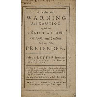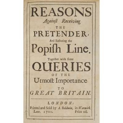 Reasons Against Receiving the Pretender. London: A. Baldwin, 1710. 8vo, 16pp., modern boards, [ESTC T810]; [Anon.] Respectful Observations on a late Print, call'd a Memorial. London: John Morphew, 1712. 8vo, 23pp., modern boards, [ESTC N13215]; Brett, Thomas The Dangers of a Relapse. A Sermon preach'd... having put an End to the Great Rebellion. London: J. What, 1713. 8vo, 24pp, modern boards, couple of repairs to title, [ESTC T357; 6 copies in UK, 1 in N. America]; [Defoe, Daniel] A Seasonable Warning and Caution against the Insinuations of Papists and Jacobites in Favour of the Pretender. London: J. Baker, 1712. 8vo, 24pp., disbound, sellotape strengthening to spine, [ESTC T56968; 12 copies UK, 6 in N. America]; [Anon.] The History of the Jacobite Clubs. London: J. Baker, 1712. 8vo, 40pp., modern boards, [ESTC T56907, 8 copies UK, 8 in N. America]; [Burnet, Sir Thomas] Le Chevalier de St. George. Whitehall, 1713, 12mo, original boards, [ESTC T146354, 8 copies UK, 7 Europe, 3 N. America]; [Defoe, Daniel] Union and no Union. Being an enquiry into the Grievances of the Scots. London: J. Baker, 1713. 8vo, 24pp., modern boards, [ESTC T56995]; [White, Kennett] A Letter to the Lord Bishop of Carlisle. London: S. Buckley, 1713. 8vo, 24pp., disbound, [ESTC T38288]; [Defoe, Daniel] Reasons against the Succession of the House of Hanover... affect the Person of the Pretender. London: J. Baker, 1713, 8vo, [2], 45pp., modern quarter calf, [ESTC T65926] (9)