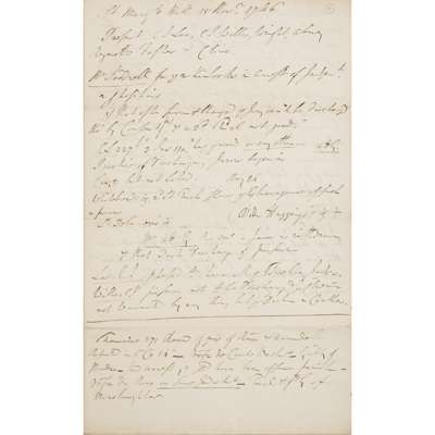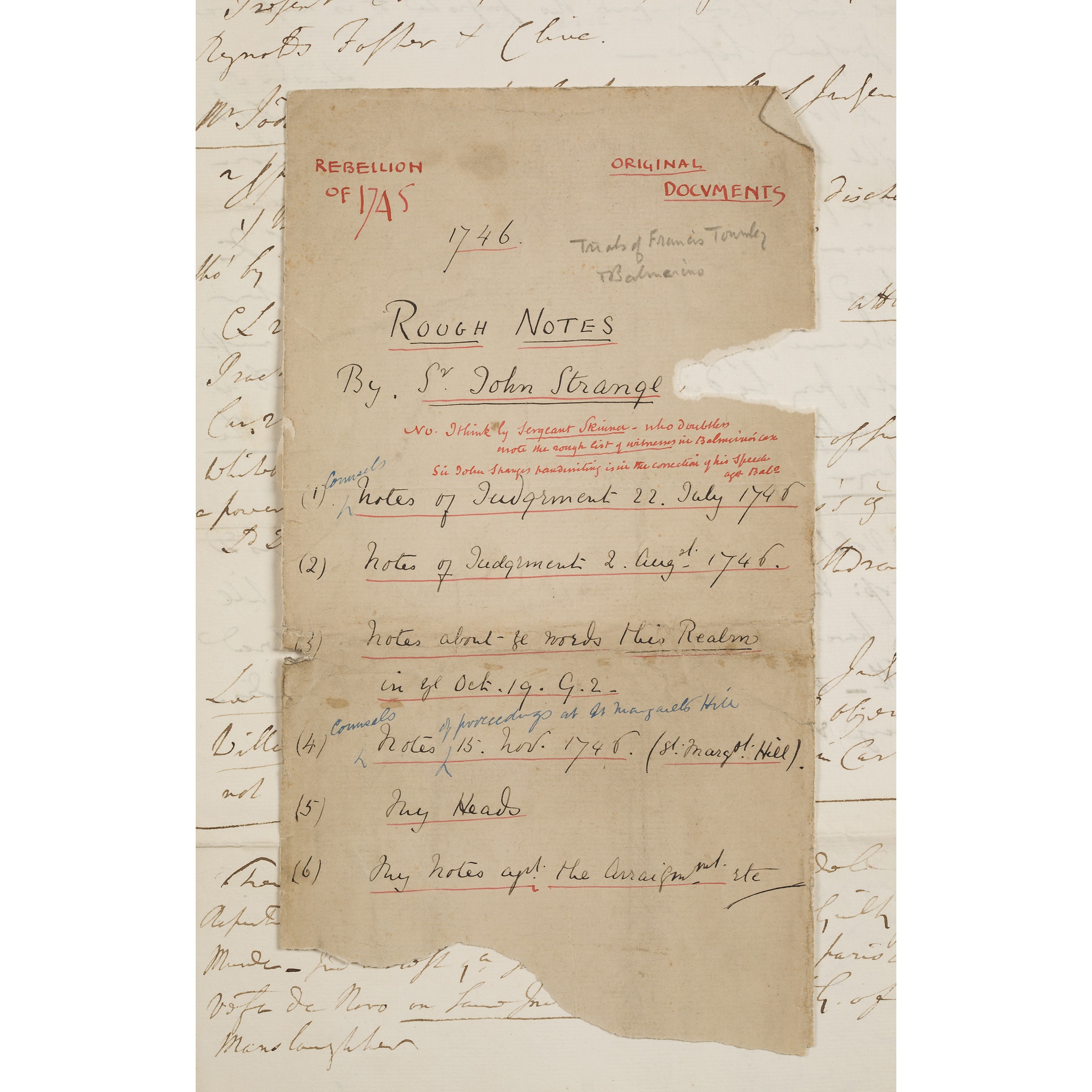 headed "St. Marg.ts Hill 15 Nov 1746", noting Present C.J. Lee, C, C.J. Willis, Wright, Reynolds, Foster, Clive, &c; "Notes of Judgment. 2 Aug. 1746", referring to D. McGranthan, M'Donald, Ogilvie, referring to people in actual custody, apprended, 1715, Carlisle, &c; "22 July 1746, When calling the Prisoners to Judgment", referring to people in actual custody; "Notes 3 July 1746 (also seemingly misdated 3 July 1743"), listing 34 named accused with their pleas of guilty or not guilty, with note "S... Wynne to putt off Trials on absence of Witnesses [...] at a Gr. distance from scene of action... a months time is proposed for those in Scotland"; "Notes of Judgment 22 July 1746", seemingly referring to [Francis] Towneley "Mr Towneley said He relied on his French Comm.", to Tyburn & "to be executed in Surry"; "Notes about the words This Realm in yet Oct. 19 G. 20" (some notes on the verso of an envelope addressed "To Sir John Strange at Leyton Grange"), with note "If any subjects of Gr. Br having Lands in Scotland shall be Guilty of H-Tr: .... that no subjt. of Engld. shall for any H. Tr. committed in Sc. be sent out of England when he is apprehended to receive his Trial until such time of both Realms shall be made one in Laws & Government w[hi]ch is the thing so much desired as that where the full perfection of the Blessed Union always began in his Maj[es]ties Royal..."; "My Heads... Indulgence"; "The Notes of the Arraignment &c.", in total 20pp, folio,