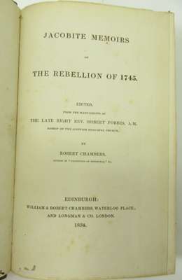 Chambers, Robert Jacobite Memoirs of the Rebellion of 1745. Edinburgh: William & Robert Chambers, 1834. 8vo, original cloth; Tayler, Alistair & Henrietta 1715: The Story of the Rising. London: Thomas Nelson and Sons Ltd., 1936. First edition, 8vo, original red cloth gilt; Mounsey, Gill, editor Carlisle in 1745, Authentic Account of the Occupation of Carlisle in 1745. London: Longman an Co., 1846. 8vo, original cloth gilt rebacked; Eardley-Simpson, L. Derby and the Forty-Five. [London]: Philip Allan, 1933. 8vo, original blue cloth gilt; Chambers, C.E.S. The Woodhouselee MS. London: W. & R. Chambers, 1907. 8vo, red cloth; Forbes, J. MacBeth Jacobite Gleanings from state Manuscripts... Edinburgh: Oliphant, Anderson and Ferrier, 1903. 8vo, original red cloth gilt; Burton, John Hill Lives of Simon Lord Lovat, and Duncan Forbes, of Culloden. London: Chapman and Hall, 1847. 8vo, original brown cloth gilt; and 50 others, sold not subject to return (57)