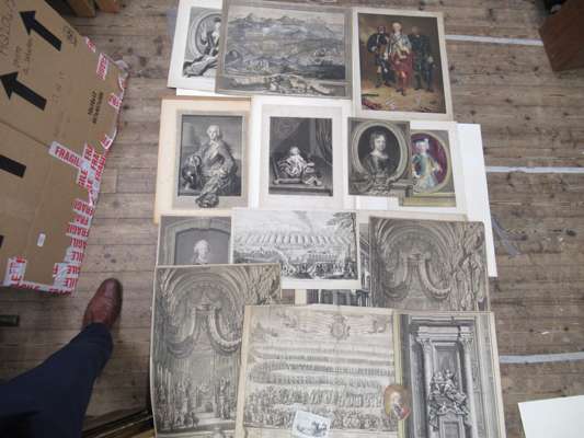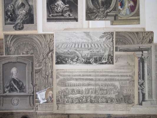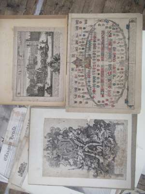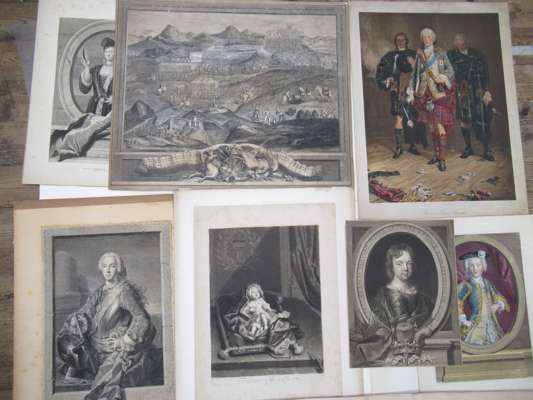 A View of ye Scotch & French Champ in Scotland, 1746. Edinburgh, [c.1750], 310 x 493mm, trimmed; Well, J.G., after L. Tocqué Carolus Walliae Princips &C. &C. &C.. [Paris:] 1748, 465 x 334mm, trimmed and laid-down; Edelinck, Nicholas [Charles Edward Stuart as a Boy], [n.p., n.d.] 428 x 320mm, hand-coloured, this variant of the engraving with the addition of a bonnet; Van Schuppen, P., after N. de Largillierre James Francis Edward Prince of Wales & Prince & Steward of Scotl:, 1692, 340 x 266mm, trimmed; John Smith after Sir Godfrey Kneller The Prince of Great Britain [Prince James Francis Edward Stuart, 1688-1766...] [London, c.1668], mezzotint, 470 x 334mm; Barun, Georg - Frans Hogenburg Nobilis Hannonia Comitatus Descriptio. [Cologne, 1595], hand-coloured, Latin text to reverse, 397 x 517mm, torn; Rare German Engraving Desprae Tendenten Triumph, oder Die Rebellion in Schottland an alle Liebhaber des Gottesdiensts und der Freyheit. [N.p., 1745], 277 x 292mm, some tears and spotting; The Funeral of James III Translatio Corporis Jacobi III, [Rome, 1766], 684 x 503mm, torn; Piranesi, Giovanni Battista Veduta del Palazzo Odescalchi, [Rome, c.1790], 511 x 700mm, worn; Houbraken, Jacobus John Duke of Argyle and Greenwich, [c.1750], 360 x 220mm, trimmed, framed and glazed; Mercier, Philippe, after Ab Obice Major [portrait of Charles Edward Stuart as Prince], [c.1760], mezzotint, 330 x 231mm, framed and glazed; and 21 others, including newspapers (32)