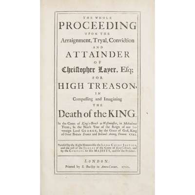 London: S. Billingsley, 1747. Folio, engraved portrait, slightly cropped & repaired; The Whole Proceedings... against William Earl of Kilmarnock; George Earl of Cromertie and Arthur Lord Balmerino for High Treason. London: S. Billingsley, 1746. Folio, one leaf loose, slight worming to a few inner margins, contemporary calf, rebacked, corners rubbed; [Chistopher Laver] The Whole Proceeding upon the Arraignment, Tryal, Conviction and Attainder of Christopher Layer. London: D. Buckley, 1722. Folio, contemporary calf, rebacked, extremities rubbed (2)