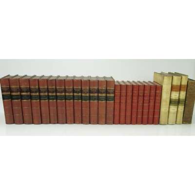 Works. London: Smith, Elder, & Co., 1889. 13 volumes, 8vo, contemporary red half calf; Tennyson, Alfred, Lord Poems. London: Macmillan & Co., 1888. 8 volumes, 8vo, contemporary red straight-grained morocco; [Idem] The Works... London: Macmillan and Co., 1894. 8vo, contemporary green half calf; Byron, George Gordon, Lord The Works... London: John Murray, 1819. 3 volumes, 8vo, contemporary vellum gilt with red and green morocco labels to volumes 2 and 3 only (25)