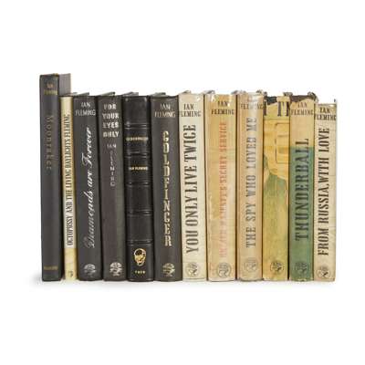 Thunderball. 1961, owner's name on front endpaper, dustwrapper discoloured and frayed with some loss at head of spine; The Spy Who Loved Me. 1962, dustwrapper frayed and slightly stained/discoloured; On Her Majesty's Secret Service. 1963, owner's name on front endpaper, dustwrapper spotted and rubbed; You Only Live Twice. 1964, inscribed on half-title "with best wishes from the Printer!!", dustwrapper; The Man with the Golden Gun. 1965, owner's name on front endpaper, dustwrapper frayed with some loss at head of spine; Octopussy and the Living Daylights. 1966, dustwrapper price clipped; and first editions of Diamonds are Forever, For Your Eyes Only without dustwrappers, a first edition of Goldfinger bound in black half morocco, a U.S. first edition of Moonraker & a Fifth impression of Goldfinger (12)