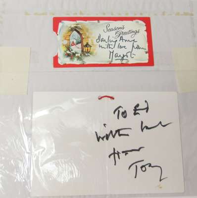 to Mrs and Mrs L.J. Hazel, 14 Nov. 1973; First Day Cover Royal Wedding. The marriage of HRH Princess Anne to Capt. Mark Phillips, 14 Nov. 1973; Princess Anne & Capt. Mark Phillips Christmas Card depicting Peter Phillips, to Mrs Hazel, [undated] signed by both; Princess Anne & Capt. Mark Phillips Christmas card to Mrs Hazel, depicting Princess Anne, Capt. Mark Phillips, Peter and Zara, [1986], signed by both; First Day Cover Royal Wedding. Edward and Sophia, 15 June 1989; Prince Edward Autograph Letter Signed to Mrs Hazel, thanking her for "sorting everything out for last weekend" and enclosing payment for provisions, Buckingham Palace, 21 Oct. 1987, with envelope; Ogilvy, Alexandra & Angus Christmas Card, 1976, inscribed and signed by both, with envelope; Ogilvy, Alexandra & Angus Christmas Card, [1988], inscribed and signed by both, envelope; Kent, Duke and Duchess of Christmas card, 1973, depicting their 3 children, signed by both; Kent, Duke and Duchess of Christmas card, 1983, depicting the family, signed by both; a Christmas gift card, Princess Margaret "Margot" to Princess Anne, Gift card to from Tony [Armstrong-Jones] to Edward; First Day Cover Major Edward Mannock VC, 1 Nov. 1977, signed "Peter Townsend" (13)