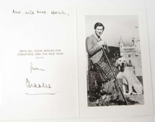 submitting an attached award for Her Majesty's approval, inscribed by the Queen "App[rove]d ER" at head, 1 page, Admiralty House, 21 May 1963; First Day Covers The Golden Wedding Anniversary 1947-1997, 13 Nov. 1997; 25th Anniversary of the Coronation, 31 May 1978; Commemorating the Investiture of H.R.H. The Prince of Wales, Caernarvon Castle, 1st July 1969; Investiture of the Prince of Wales, 1 July 1969; Charles, Prince of Wales Letter thanking correspondent for the splendid 21st birthday present, with envelope, undated; Charles, Prince of Wales Christmas card for 1970 incorporating photograph of Charles, signed, addressed to Mrs Hazel, with envelope; Charles, Prince of Wales Christmas card for 1978 incorporating black and white photograph of Charles, signed, addressed to Mr and Mrs Hazel, with envelope; Charles, Prince of Wales Christmas card for 1980, depicting a watercolour by Prince Charles, signed, addressed to Sir Fitzroy and Lady Maclean; Parker Bowles, Camilla Christmas card addressed to "Thomas", signed, undated; First Day Cover The Royal Wedding, 29 July 1981; Diana Princess of Wales, 3 Feb. 1998 (12)