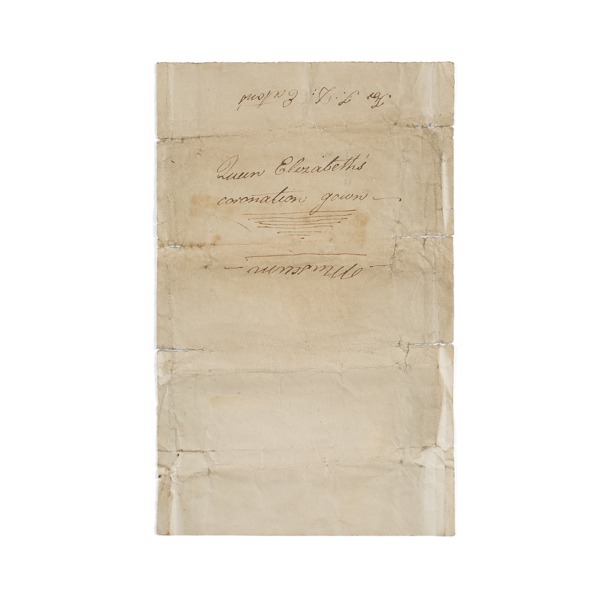 with 19th century piece of paper inscribed "Museum, Queen Elizabeth's coronation gown, for J.D. Eaton's"