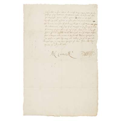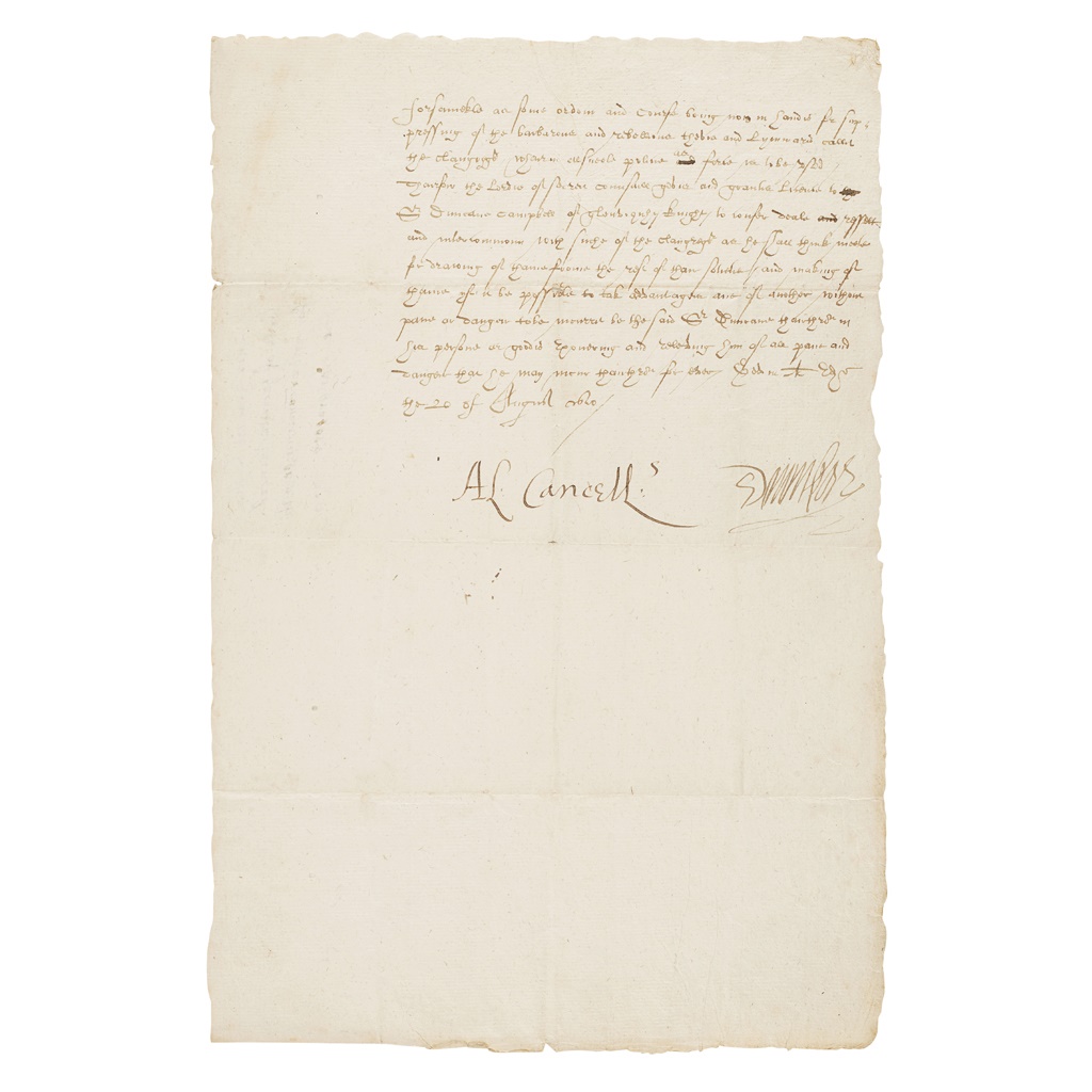 giving him permission to 'intercommnune' with certain members of the Clan Gregor, 250 x 200mm., with twelve lines of writing and signatures possibly of James Primrose (clerk to the Privy Council, [d.1641]) and A.L. Cancell.s, which could be Alexander Seton, the Lord Chancellor of Scotland [1604-1622], title to verso, folded into 8, 4 small wormholes affecting one letter and two small holes along centre fold, affecting one word