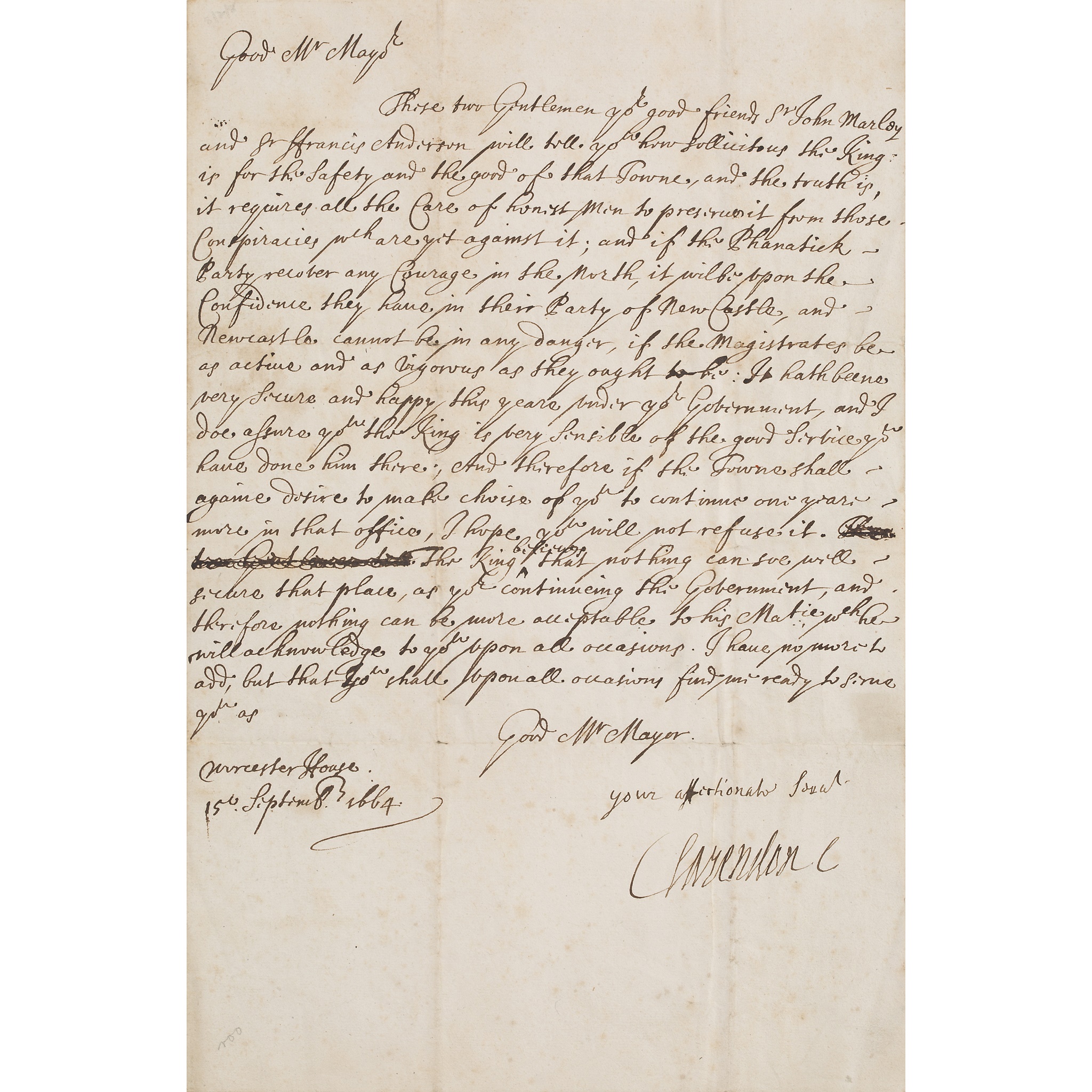 stating how solicitous the King is for the safety and good of Newcastle, remarking that the best bulwark against the recovery of the "Phanatick party" in the north is the active and vigorous work of the magistrates, complimenting Clavering on his good governance and urging him to continue his government of the city, bifolium, 32 by 20cm., Worcester House, 15 September 1664, address panel holed from removal of wax seal (purchased Lyon & Turnbull, 10 June 2009, lot 252 for £480 hammer)