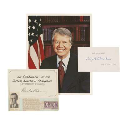 partially printed document signed, 20th July 1883, issued by the Executive Chamber of the State of New York, ordering 'all gases and vapors produced be condensed or burned', signed by Cleveland in his capacity as Governor of New York, 2 pages, folio; together with A.L.S. by Frances Cleveland, First Lady of the USA, to an unidentified correspondent, on blue monogrammed stationery, Executive Mansion, Washington, 26 Oct. 1895; Photographic carte-de-visite of Grover Cleveland, 1888; Roosevelt, Theodore Signature at head of an ALS to Roosevelt, requesting his signature, 22 May 1919, neatly laid down at upper edge, some dust-staining affecting signature, 170 x 130mm.; Taft, William H. Typed Letter Signed, to Mr A.J. Jacobs thanking him for a copy of his book "Neutrality versus Justice", one page, 26th Nov. 1917; Wilson, Dr. Woodrow Autograph signature dated 24/1/18 on card with his title in another hand above, 88 x 154mm.; Roosevelt, Franklin Signature at edge of envelope marking 1932 Democratic National Convention, Chicago, Illinois; Truman, Harry S. Typed letter Signed, to Rufus Burrus, stating he is enclosing a contributory cheque to the Building Fund of the Library, 1 page, Dec. 29 1962, file holes to top edge; Hoover, Herbert Typed Letter Signed, or Mr John H. Wiechart, brief comment on the states organising the high schools, 1 page, Waldorf Astoria, 31 March, 1943; Eisenhower, Dwight D. Signature on card as Chief of Staff, U.S. Army, War Department, 75 x 126mm.; Johnson, Lyndon B. Typed Letter Signed, thanking Mr Gilbert J. Tillbury for his support, 1 sheet, United States Senate, May 12, 1960, 1 leaf; Nixon, Richard Colour photograph of Nixon with family, on occasion of 50th wedding anniversary, 21 June, 1990, signed; Carter, Jimmy Colour photograph, 25 x 20cm., signed lower right; Reagan, Ronald Signed black and white portrait photograph, inscribed "To A. Rabaiotti, with best wishes, Ronald Reagan", 203 x 255mm., Ford, Gerald 1 black and white, and 1 colour photograph, both signed, 175 x 86mm., & 250 x 200mm.Bush, Senior, George Black and white photograph inscribed "To Steven [?} Sinnerly, George Bush", 250 x 200mm.; Clinton, Bill Black and white photograph, signed, 252 x 200mm.; Bush, Junior, George Black and white photograph, signed, 175 x 125mm. (17)
