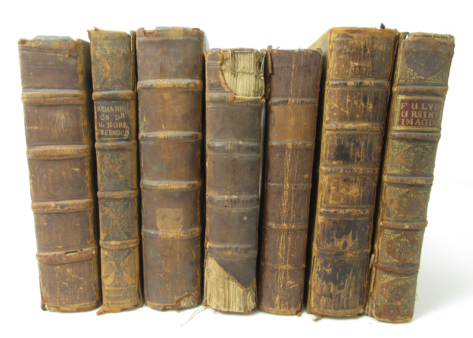 Galle, Theodore Illustrium Imagines... Antwerp: Platiniana, 1606. 8vo, lacking plate 19, contemporary calf; Godwin, Francis A Catalogue of the Bishops of England... London: Thomas Adams, 1615. 8vo, contemporary calf; Cowell, John The Interpreter. London: William Sheares, 1637. Small 4to, contemporary calf, binding worn, worming and dampstaining; Durel, John Sanctae Ecclesiae Anglicanse Adversus... London: William Wells and Robert Scott, 1669. Small 4to, contemporary calf, lacking initial imprimatur leaf [ESTC R15740]; Remarks on Dr. Henry More's Expositions of the Apocalypse and Daniel... London: printed by T.M. for the Author, 1690. 4to, contemporary panelled calf rubbed [ESTC R200629]; Douglass, William A Summary, Historical and Political, of... the British Settlements in North-America. London: R. Baldwin, 1755. Volume 1 only, UK reprint, folding map hand-coloured in outline and torn, contemporary calf