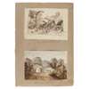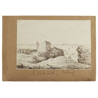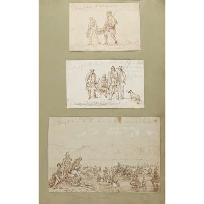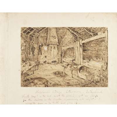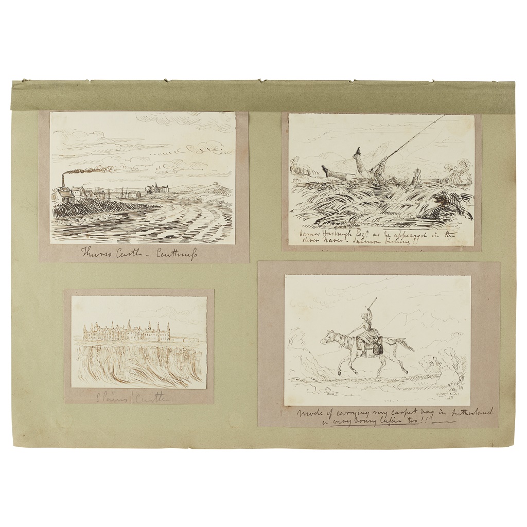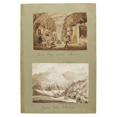 Note: This extensive collection of drawings appears to record the journey of a James Horsburgh Esq. around the Highlands of Scotland in the mid-19th century. One sketch is signed 'J. Horsburgh', whilst another depicts a self-caricature of the artist falling in a river whilst fishing. The caption reads: "James Horsburgh Esq. as he appeared in the River Naver, salmon fishing!!" All the drawings are captioned - some rather amusingly ("Mode of carrying my carpet bag in Sutherland and a very bonny lassie too!") Whilst many of the illustrations show idyllic Highland scenes and castles, several are exceptional in that they depict the interiors of Highland cottages at the time. An illustration entitled "Thos. Og's Cottage, Torrisdale, Sutherland" depicts a family and beasts, sitting around a central cooking pot inside a cottage, whilst a figure looks across the room from a box bed. Another depicts the interior of a shepherd's cottage, where it appears Horsburgh spent the night in the company of a crying baby and the family pig helping itself to the contents of a cooking pot!
