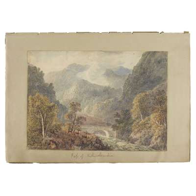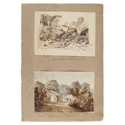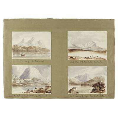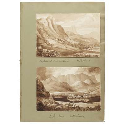 98 mounted sketches, mostly watercolour but some pen and ink, showing scenery around Sutherland and Killiecrankie, with several showing interior scenes of crofts, and 4 mounted albumen photographs showing Highland estate workers, c.1850