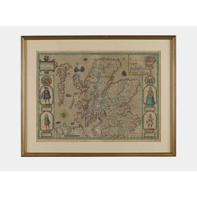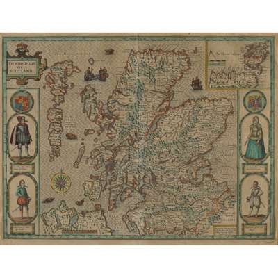 London: John Sudbury and George Humbell, 1610, hand-coloured, flanked with four figures of the royal family and an inset of Orkney, a little light browning, small closed tear to lower right corner