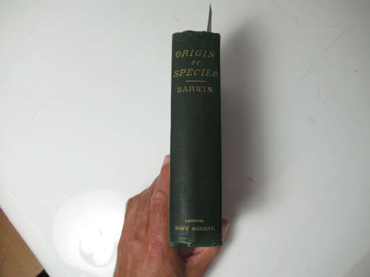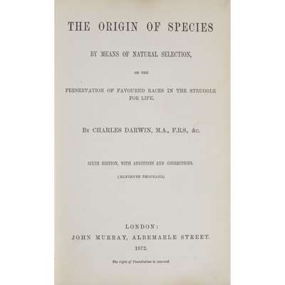 London: John Murray, 1872. Sixth edition (eleventh thousand), 8vo, half-title with photograph of Darwin, folding diagram, chocolate brown endpaper with bookplate, ownership inscription to half-title page, original green blindstamped cloth, lettered in gilt to spine, Freemans 391, joints split, very slight rubbing to cover, spine edges slightly worn, slight discolouration to edges, pencil markings to text in places
