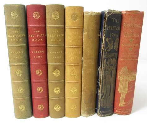 The Blue Fairy Book. London: Longman, Green, and Co., 1889. First edition, 8vo, blue half morocco gilt; The Red Fairy Book. London: Longmans, Green and Co., 1890. First edition, 8vo, red half morocco gilt; The Green Fairy Book. London: Longmans, Green, and Co., 1892. First edition, 8vo, green half morocco gilt; The Yellow Fairy Book. London: Longmans, Green, and Co., 1894. First edition, 8vo, yellow half morocco gilt; and another copy, first edition, in original yellow cloth gilt, worn, hinges and joints split, several plates coloured in; The Violet Fairy Book. London: Longmans, Green, and Co., 1901. First edition, 8vo, original violet cloth gilt, worn, some pages missing; The Red Book of Heroes. London: Longman, Green and Co., 1909. First edition, 8vo, original red cloth gilt, gift inscription to half-title (7)