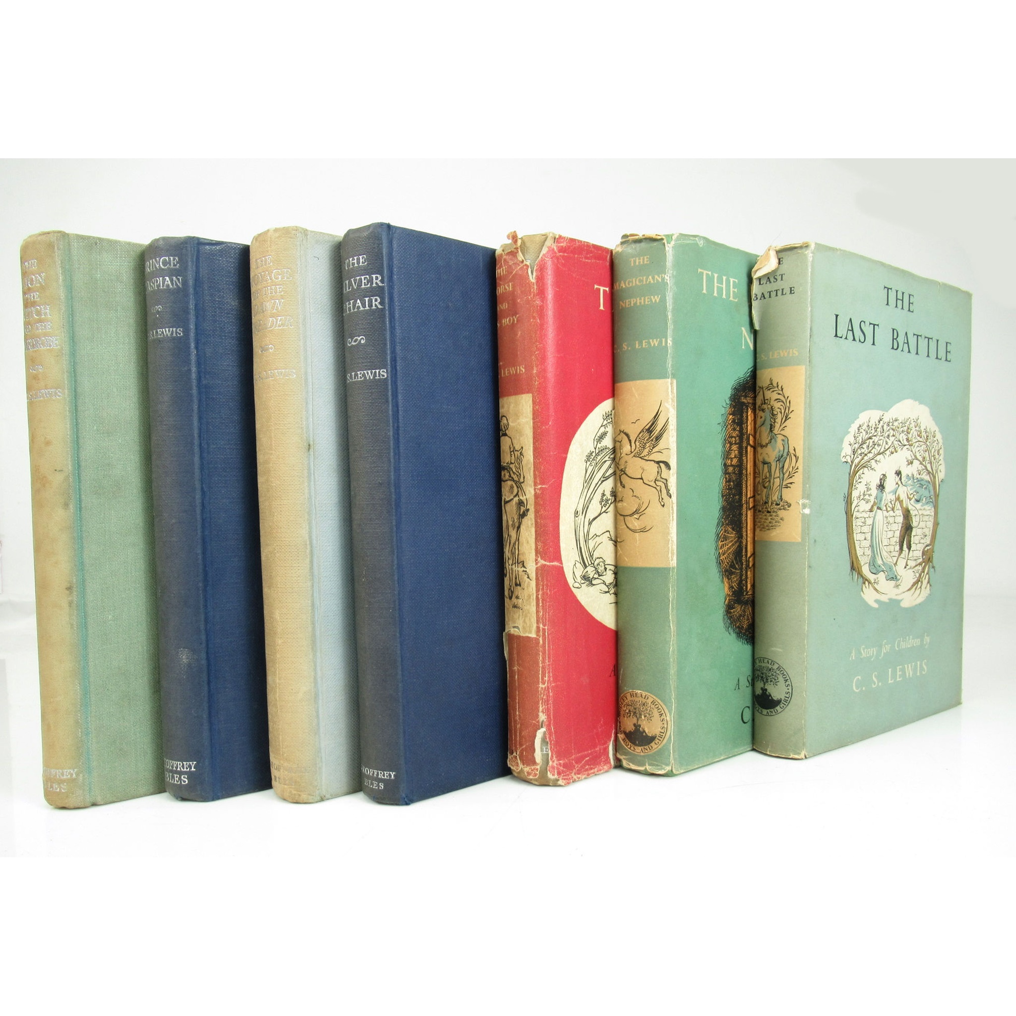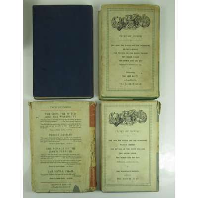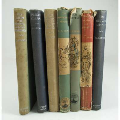 London: Geoffrey Bles, 1950-1956. 7 volumes, comprising: The Lion, The Witch and The Wardrobe, first edition, original cloth, without dust-jacket; Prince Caspian, [n.d.], original cloth, without dust-jacket; The Voyage of the Dawn Treader, [n.d.], original cloth, without dust-jacket; The Silver Chair, 1953, original cloth, without dust-jacket; The Horse and His Boy, 1954, original cloth, dust-jacket with some wear and tear, some illustrations neatly coloured; The Magician's Nephew. London: The Bodley Head, 1955, original cloth, dust-jacket slightly chipped and foxed; The Last Battle. London: The Bodley Head, 1956, original cloth, dust-jacket not price-clipped but with small tear at head of spine; all 8vo (7)