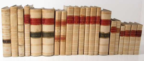 Storia Pittorica della Italia... Bassano: Tipografia Remondini, 1818. 6 volumes, 8vo, contemporary vellum gilt with red morocco gilt labels to spines; Alighieri. Dante La Divina Commedia... Florence: Giuseppe Molini, 1839. 3 volumes, 12mo, contemporary vellum gilt with red morocco labels to spines; Denina, Carlo Delle Rivoluzioni d'Italia. Milan: Società Tipografica de'Classici Italiani, 1820. 3 volumes, 8vo, contemporary vellum gilt with red and green morocco labels to spines; Verri, Alessandro Opere Scelte... Milan: Società Tipografica de'Classici Italiani, 1822. 2 volumes, 8vo, contemporary vellum gilt with red morocco labels to spines; Molini, Giuseppe Vita di Venvenuto Cellini... Florence: Tipografia All'Insegna di-Dante, 1832. 8vo, volume 1 only, contemporary vellum gilt; and six others