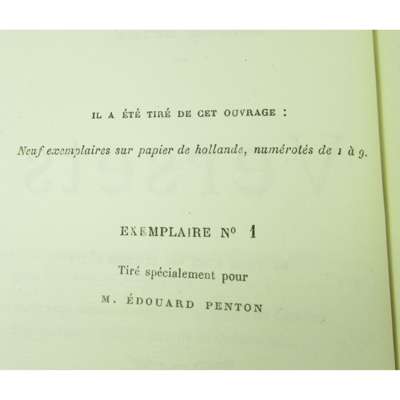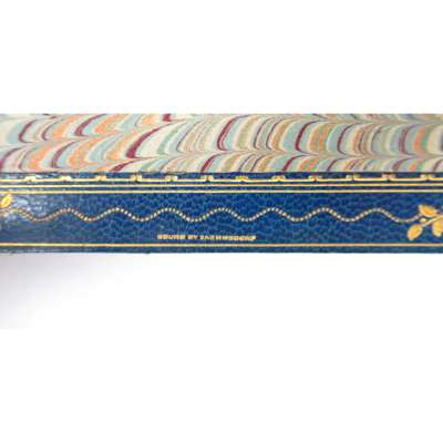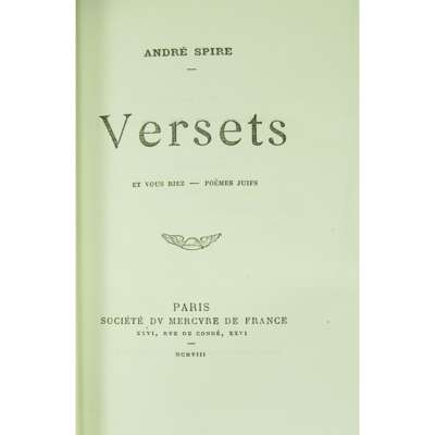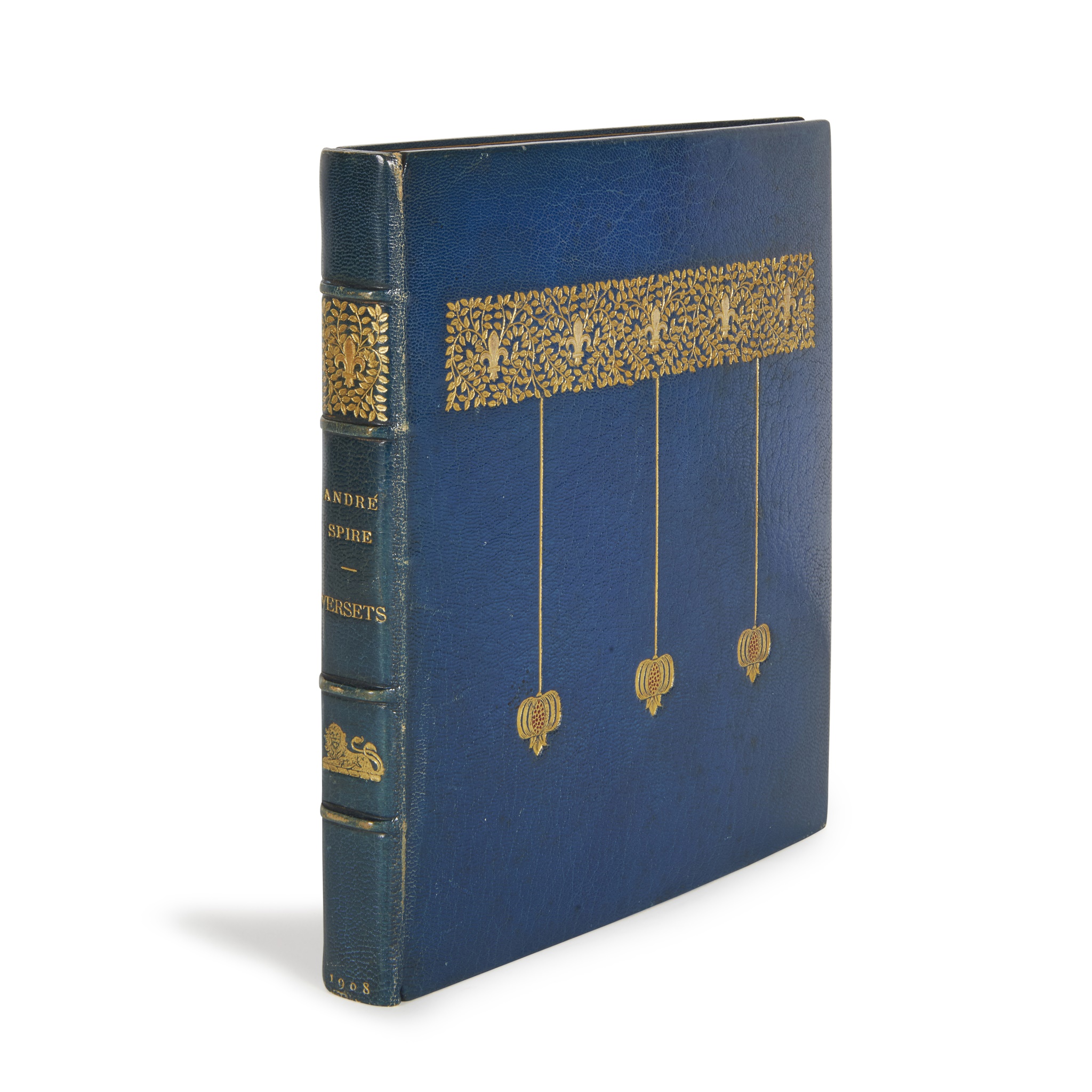Versets et ous riez - poèmes juifs. Paris: Société du Marcure de France, 1908. 8vo, 1 of 9 copies, contemporary blue morocco with art nouveau style gilt tooling depicting fleur-de-lis amongst foliage with hanging pomegranate blossoms, spine banded in 5 compartments with gilt fleur-de-lis and foliage motifs, gilt doublures with leaf branches to end papers, signed 'bound by Zaehnsdorf', spine sunned, some wear to cover edges, some spotting throughout
