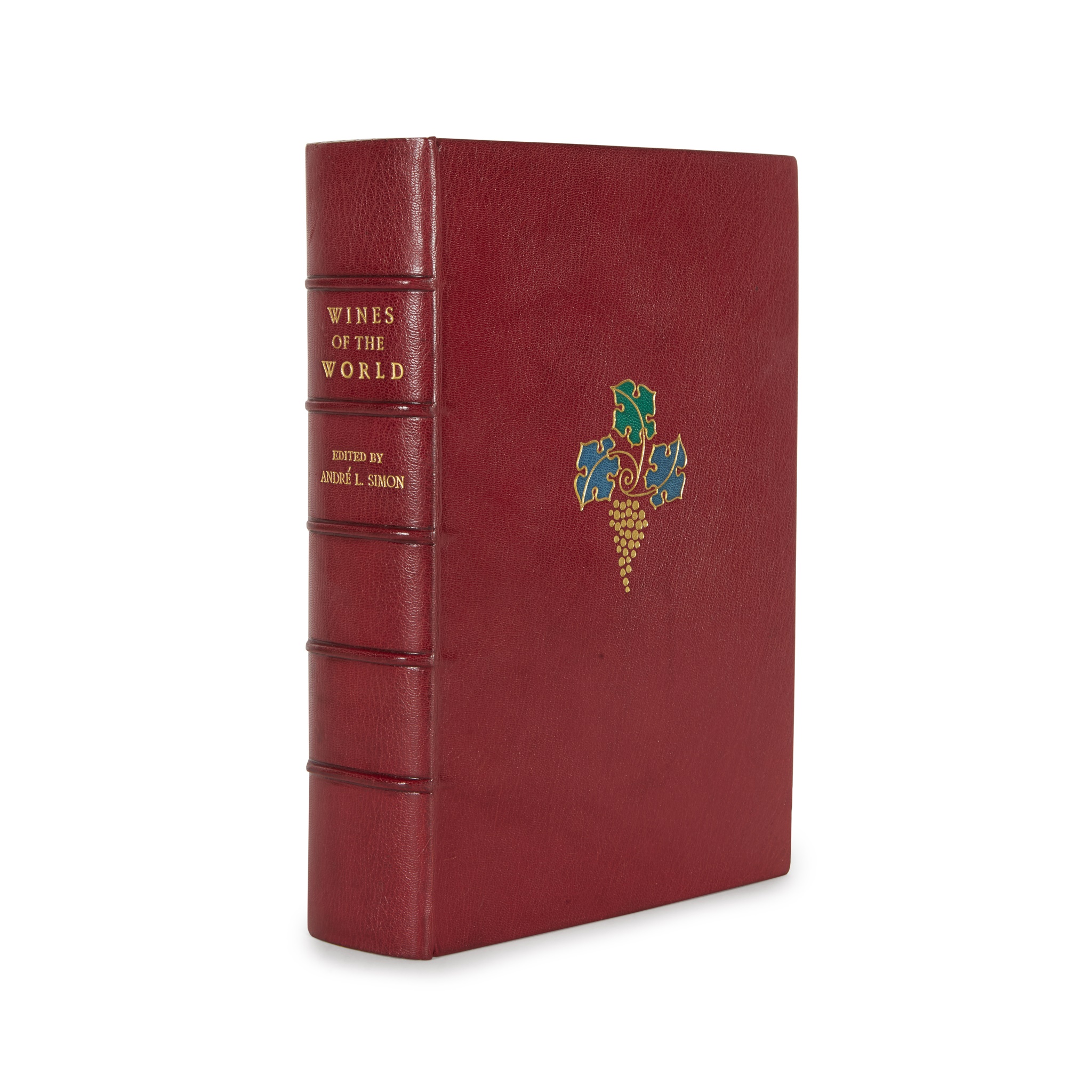 Wines of the World. Arcadia Press, 1971. Number 159 of 265 copies signed by the author, plates, original red morocco with blue and green onlays and gilt tooling of bunch of grapes on upper cover, original cream folding cloth box