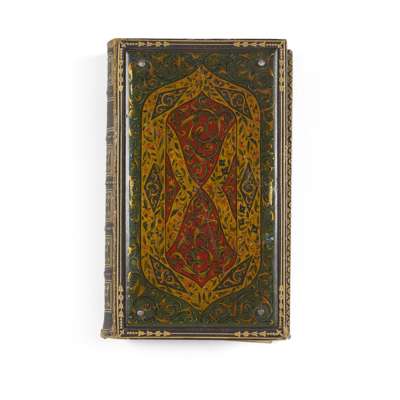London: George E. Eyre and Andrew Spottiswoode, [n.d., 19th century]. 12mo, additional chromolithographed title-page and 8 chromolithographed plates, bound with an 1845 Book of Psalms, contemporary hand-painted and varnished wooden covers with an elaborate red and gilt central panel surrounded by a green border with green and gilt interwoven foliate motifs, reminiscent of mediaeval manuscript illumination, spine and edges brown morocco gilt