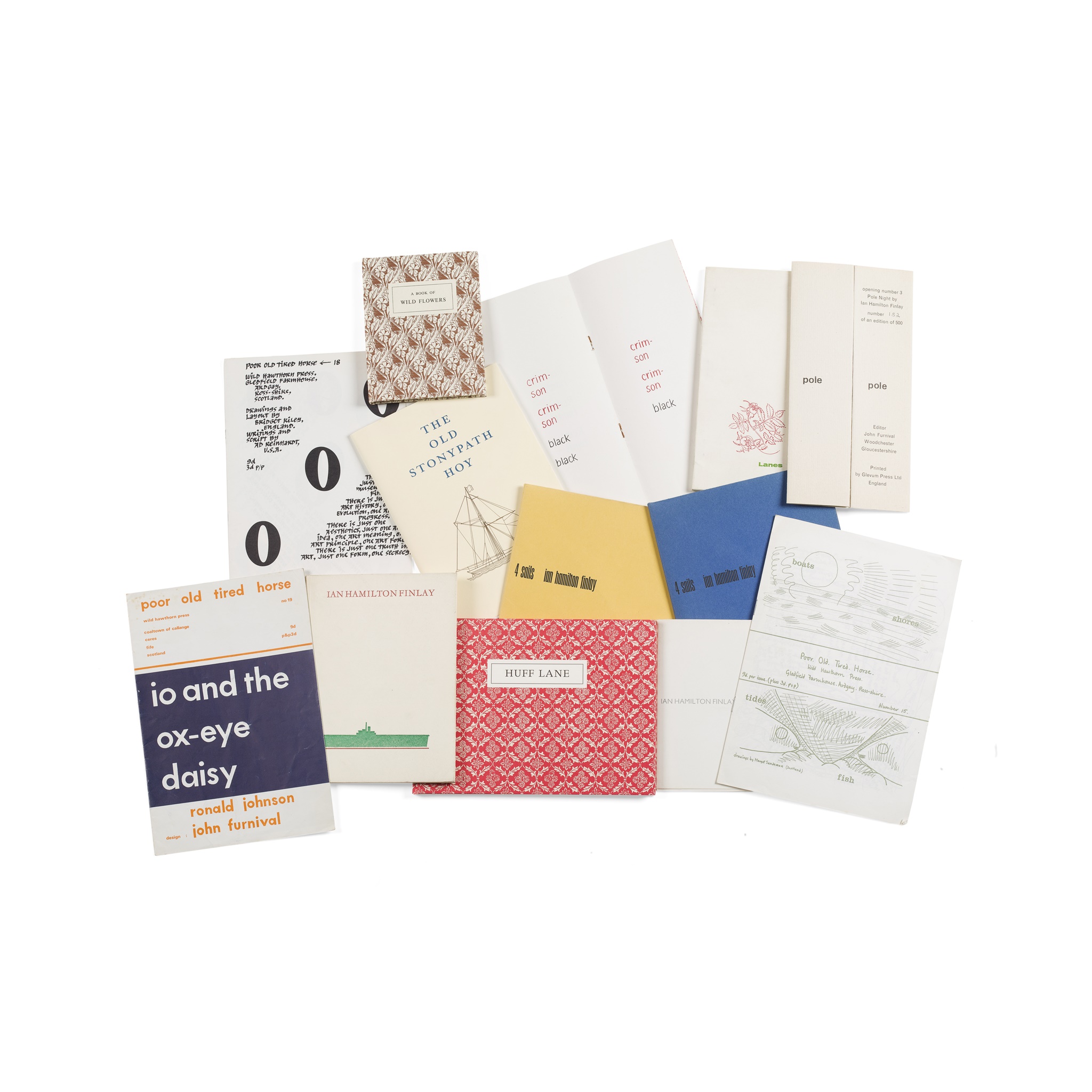 Huff Lane. [Little Sparta, Dunsyre:] Wild Hawthorn Press, 2000. 8vo, one of 300 copies, original paper covered boards; A Book of Wild Flowers. [Little Sparta, Dunsyre:] Wild Hawthorn Press, 1994. 12mo, one of 250 copies, original paper covered boards, accompanied by a Christmas card signed 'Ian'; The Old Stonypath Hoy. [Little Sparta, Dunsyre:] Wild Hawthorn Press, 1991. 8vo, original wrappers, accompanied by a Christmas card signed 'Ian'; Gillanders, Robin, photographer Brount, and Idyll. Eindhoven: Peninsula, 1995. 4to, original wrappers; Homage to Robert Lax. [Little Sparta, Dunsyre:] Wild Hawthorn Press, [n.d.] Oblong 8vo, original wrappers; Sandeman, Margaret, illustrator Lanes. [Little Sparta, Dunsyre:] Wild Hawthorn Press, 1969. Oblong 8vo, original wrappers; Seven Definitions. Kiel: Galerie Sfeier-Semler, 1991. Oblong 12mo, original wrappers; Poor. Old. Tired. Horse. Edinburgh: Wild Hawthorn Press, [1962-1967?]. Comprising volumes 1, 2, 7, 12, 13, 14, 15 (three copies), 16 (two copies), 17 (three copies), 18 (three copies), 19 (three copies), 20 (three copies), 21 (four copies), 22, 23 (two copies), 24 (two copies), 25 (two copies); a short signed handwritten note on Little Sparta headed paper, discussing allotments; and a collection of other ephemeral items (quantity)