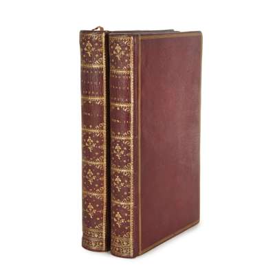 London: John Pine, 1733-37. 2 volumes, 8vo, frontispiece, [30], [265]; frontispiece, [20], 191, [13], engraved throughout, lists of subscribers, second issue, identified by the word "potest" on the medal on page 108 of vol 2, contemporary French red morocco gilt, two corners lightly bumped