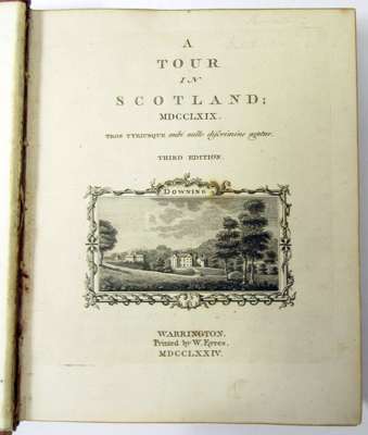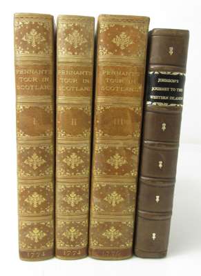 Warrington: printed by W. Eyres, 1774. Third edition, 4to, engraved title-page, 21 plates [ESTC T113910]; [Idem] A Tour in Scotland and Voyage to the Hebrides. Chester: printed by John Monk, 1774. 4to, engraved title-page, 44 plates [ESTC T113907]; [Idem] A Tour in Scotland MDCCLXXII Part II. London: Benj. White, 1776. 4to, engraved title-page, 47 plates; uniformly bound in contemporary calf gilt, one book neatly rebacked, bookplates; [Johnson, Samuel] A Journey to the Western Islands of Scotland. London: A Strahan; and T. Cadell, 1791. "New edition", 8vo, modern quarter calf [ESTC T83971] (4)