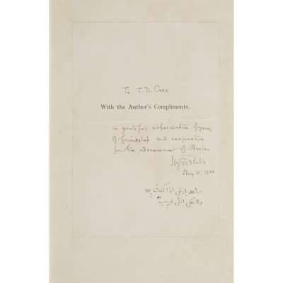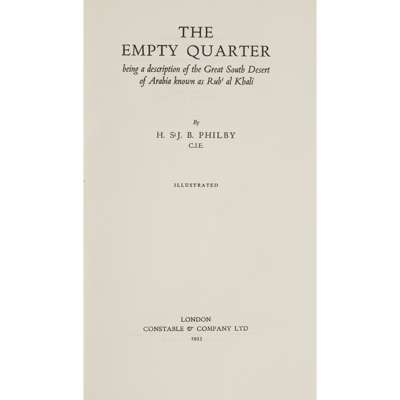 being a description of the Great South Desert of Arabia known as Rub' al Khali. London: Constable & Company Ltd., 1933. 8vo, compliments slip pasted to front free-endpaper inscribed and signed by the author: To T.D. Cree, in grateful appreciation of years of friendship and cooperation for the advancement of Arabic, H St J Philby, May 31, 1933 [Arabic text]", frontispiece, 32 photographic plates, folding plan, 2 folding maps, original green cloth gilt, one map detached