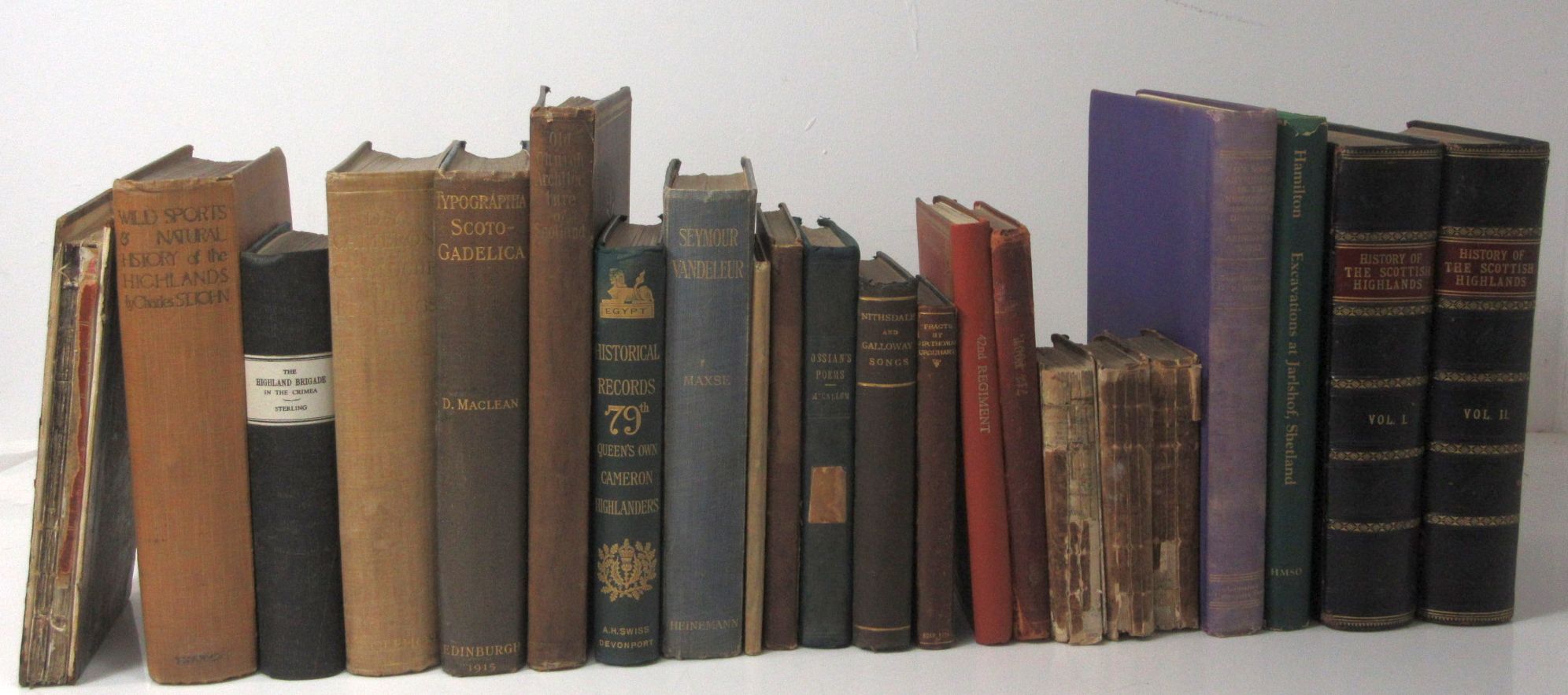 An Illustrated Catalogue of his Etched Work... Glasgow: James Maclehose and Sons, 1912. 4to, original cream cloth gilt; St John, Charles Wild Sports & Natural History of the Highlands. Edinburgh: T.N. Foulis, 1919. 8vo, original cloth; Logan, James The Scottish Gaël, [n.d.] New edition, 2 volumes, 8vo, colour frontispieces, green cloth; Shirrefs, Andrew Poems, Chiefly in the Scottish Dialect. Edinburgh: W. Creech and P. Hill, 1790. 8vo, portrait, later half calf; Sterling, Anthony The Story of the Highland Brigade in the Crimea. London: Remington & Company, 1895. 8vo, later cloth, lacks one plan, stamps of Chelsea Public Library; MacLean, Donald Typographia Scoto-Gadelica... Edinburgh: John Grant, 1915. 8vo, number 12 of 250 copies signed by the author, original cloth gilt, some soiling to covers; Keltie, John S. A History of the Scottish Highlands. Edinburgh: A. Fullarton & Co., 1875. 2 volumes, 8vo, contemporary half calf gilt; Johnson, Samuel A Journey to the Western Islands of Scotland. Edinburgh: J. Ogle..., 1811. New edition, 8vo, green cloth gilt; Saussure, L.A. Necker de Travels in Scotland. London: Richard Phillips and Co., 1821. 8vo, without covers; [Idem] A Voyage to the Hebrides... London: Sir Richard Phillips & Co., 1822. 8vo, without covers; and 16 others (27)